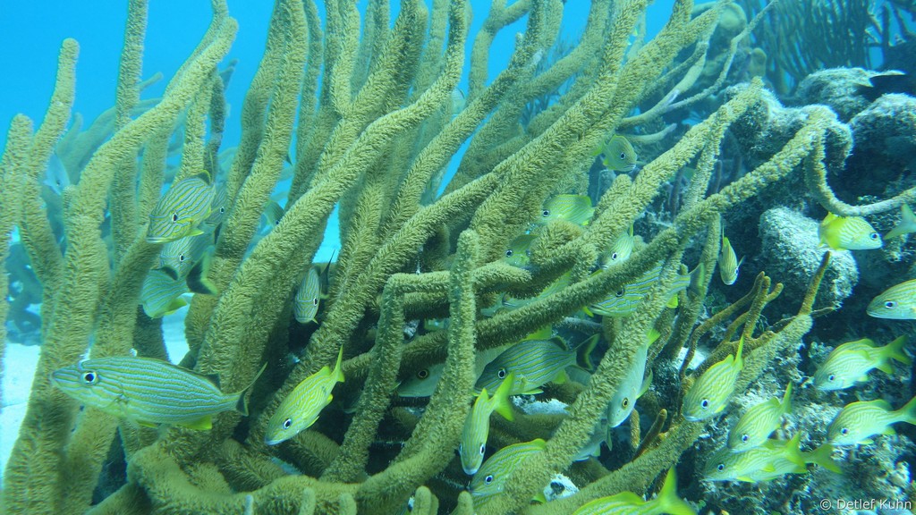 An exponierten Stellen mit starker Strömung oder starkem Wellenschlag können nur Arten überleben, die speziell an diese Bedingungen angepasst sind. Besonders widerstandsfähig ist die Elchgeweihkoralle, deren dicke Kalksteinäste den Kräften von Strömung und Wellen trotzen. In etwas tieferem Wasser sind andere Korallenarten häufiger anzutreffen, darunter die Hirschgeweihkoralle sowie Fingerkorallen und Sternkorallen.