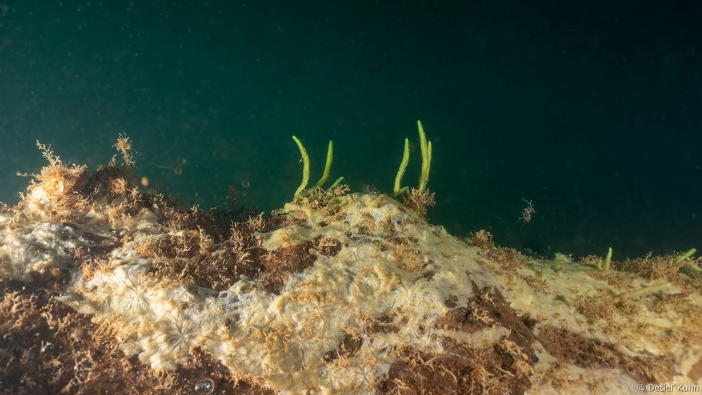 - Spongilla lacustris - Geweihschwamm: Schwammkörper ist meist geweihartig verzweigt. Auf dem Schwamm siedeln sich an gut belichteten Stellen einzellige Grünalgen