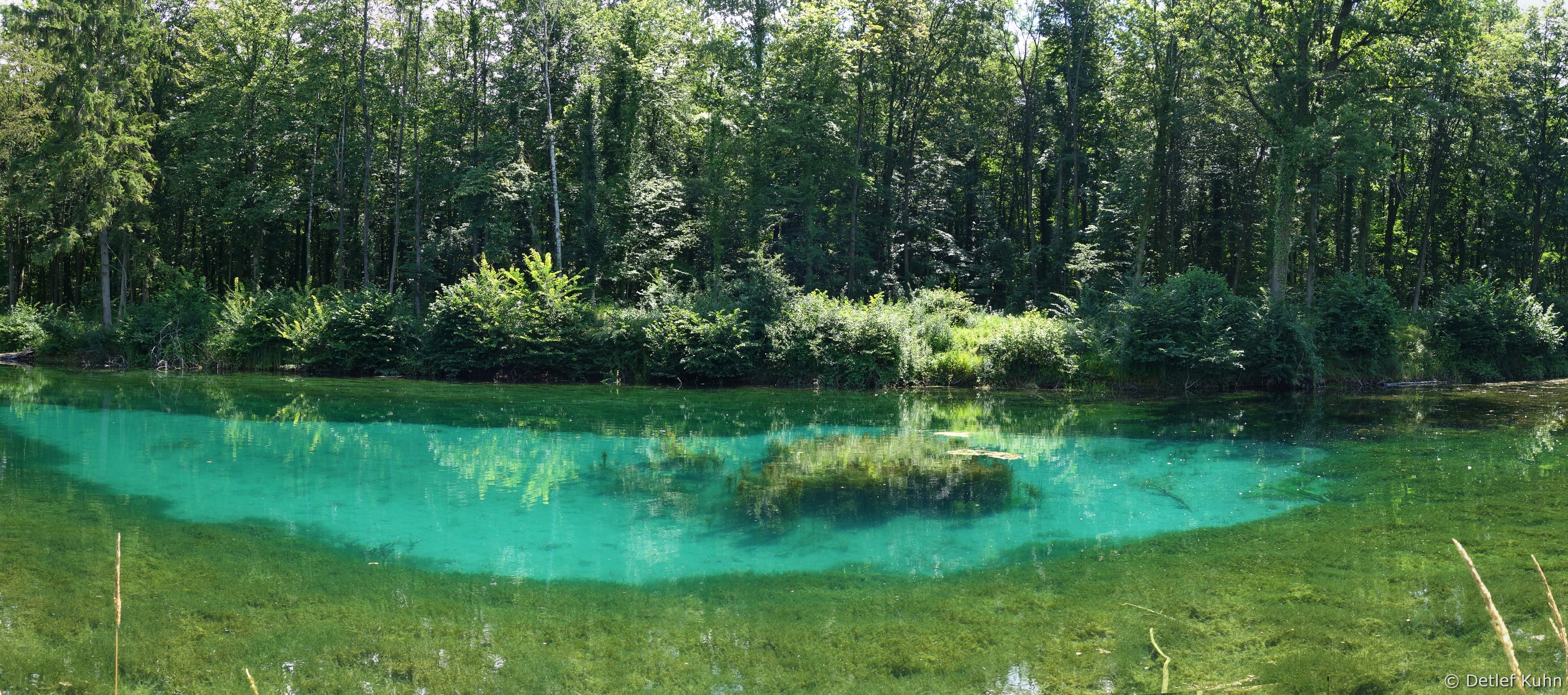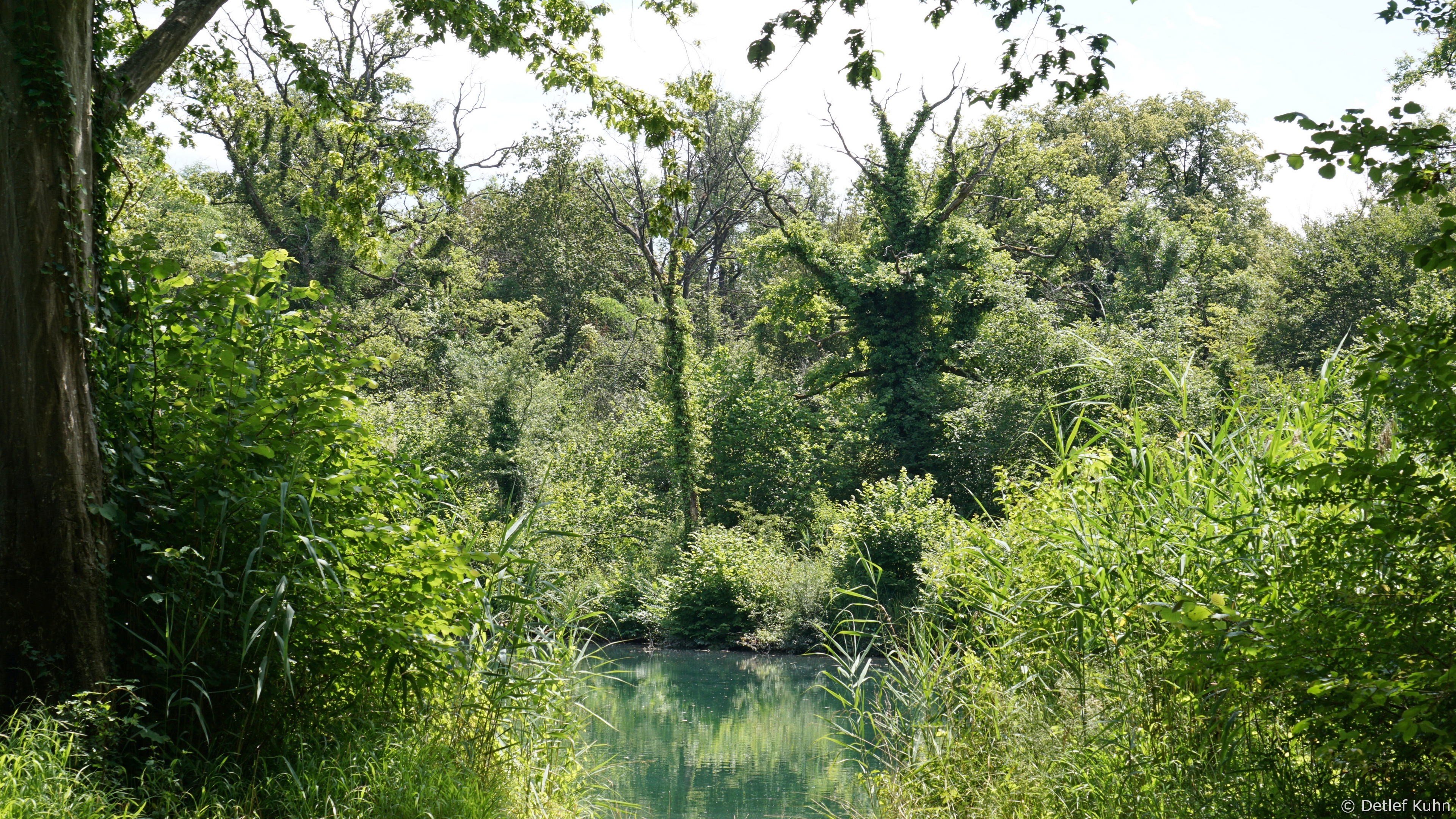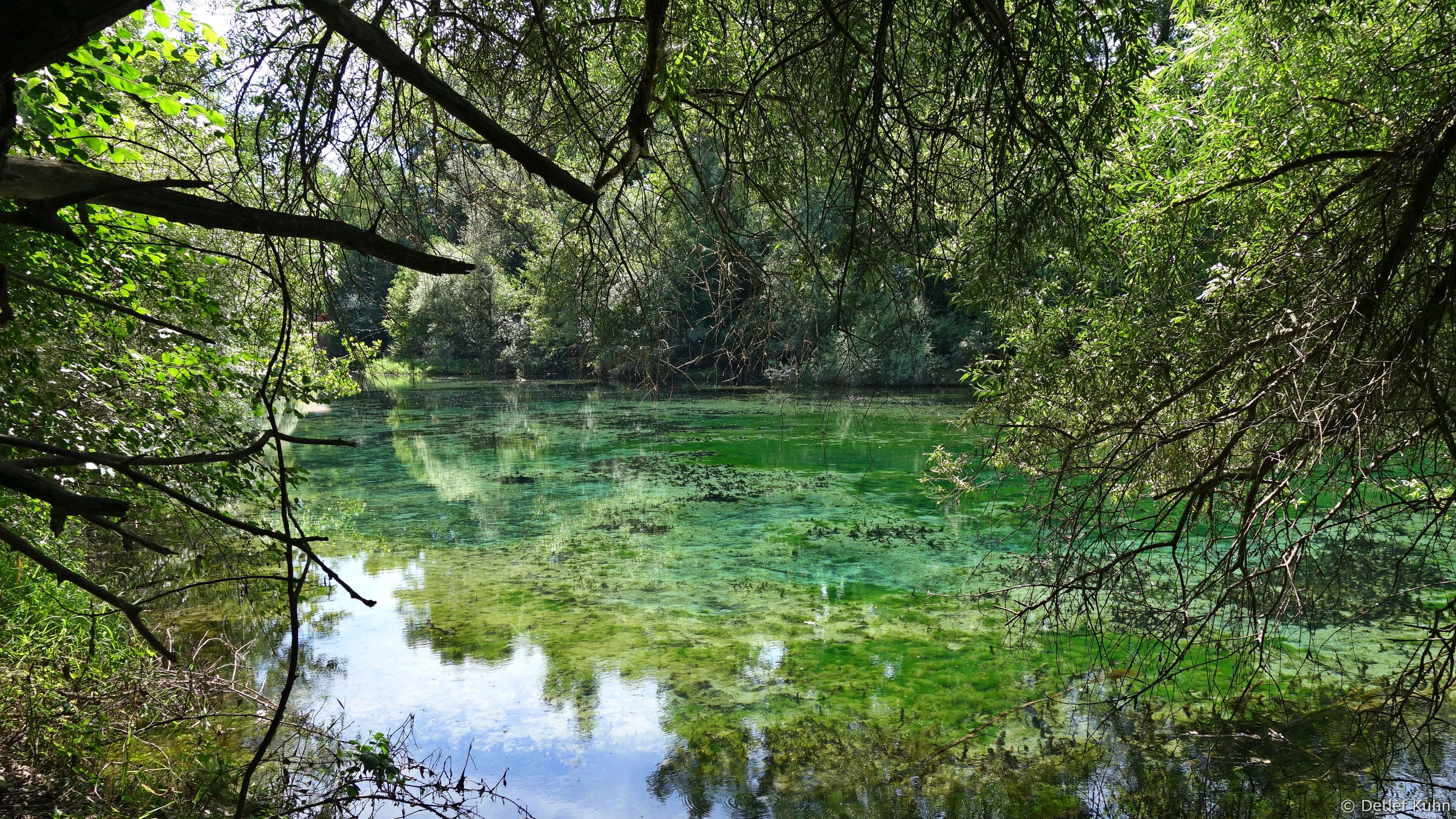 Ein kleiner See mitten im Auwald am südlichen Oberrhein mit kristallklarem, kaltem Wasser.