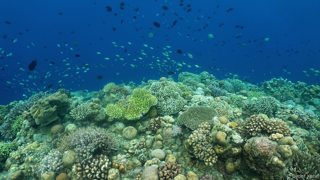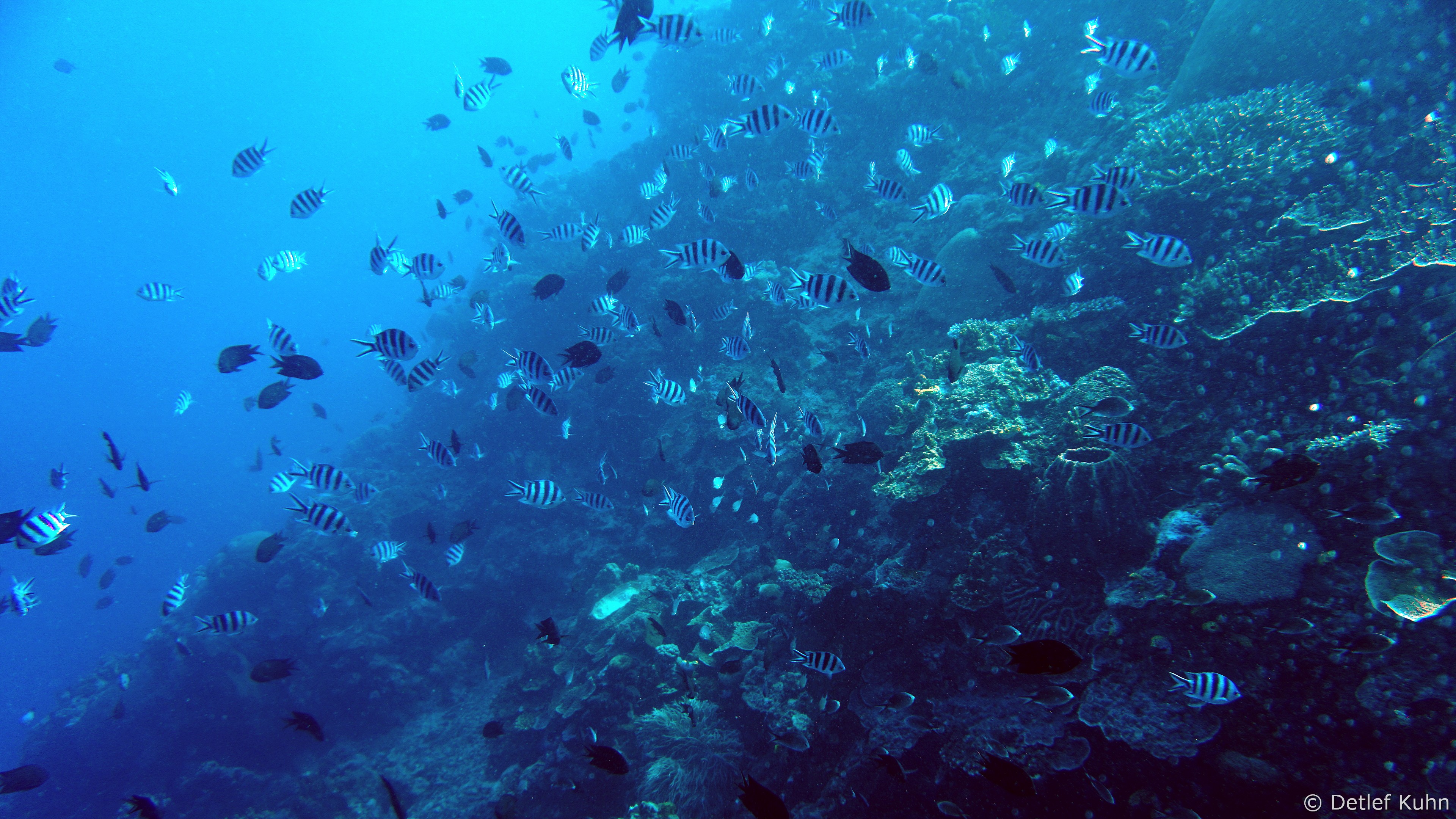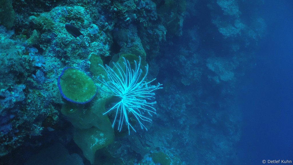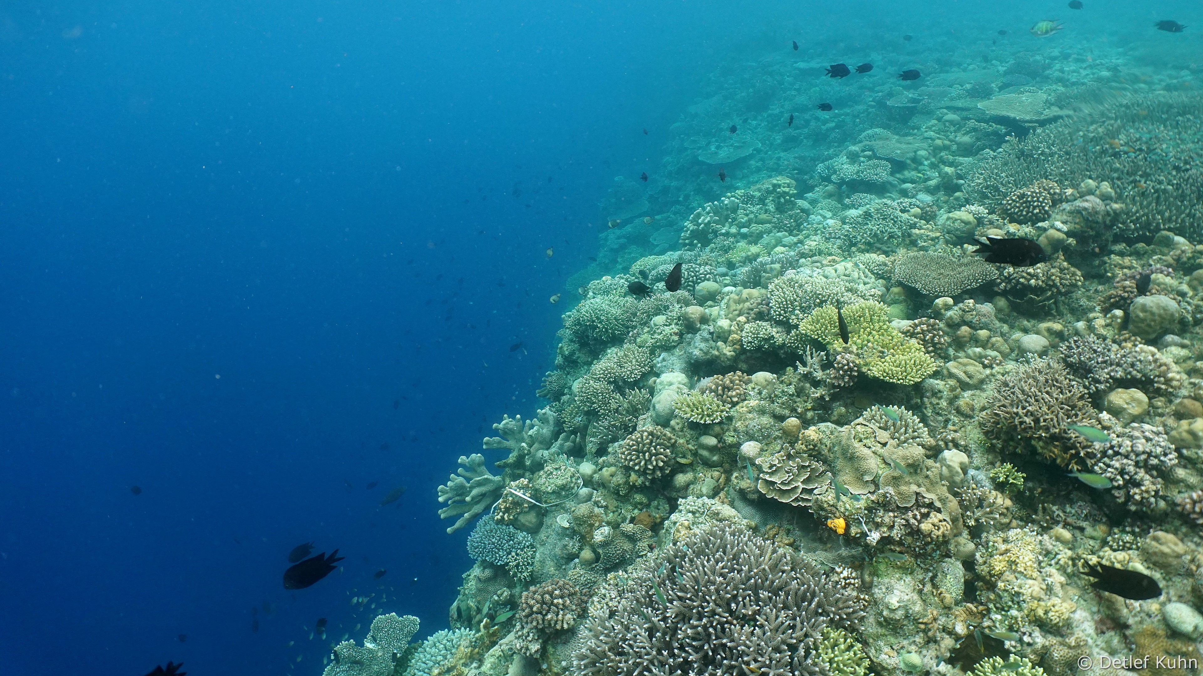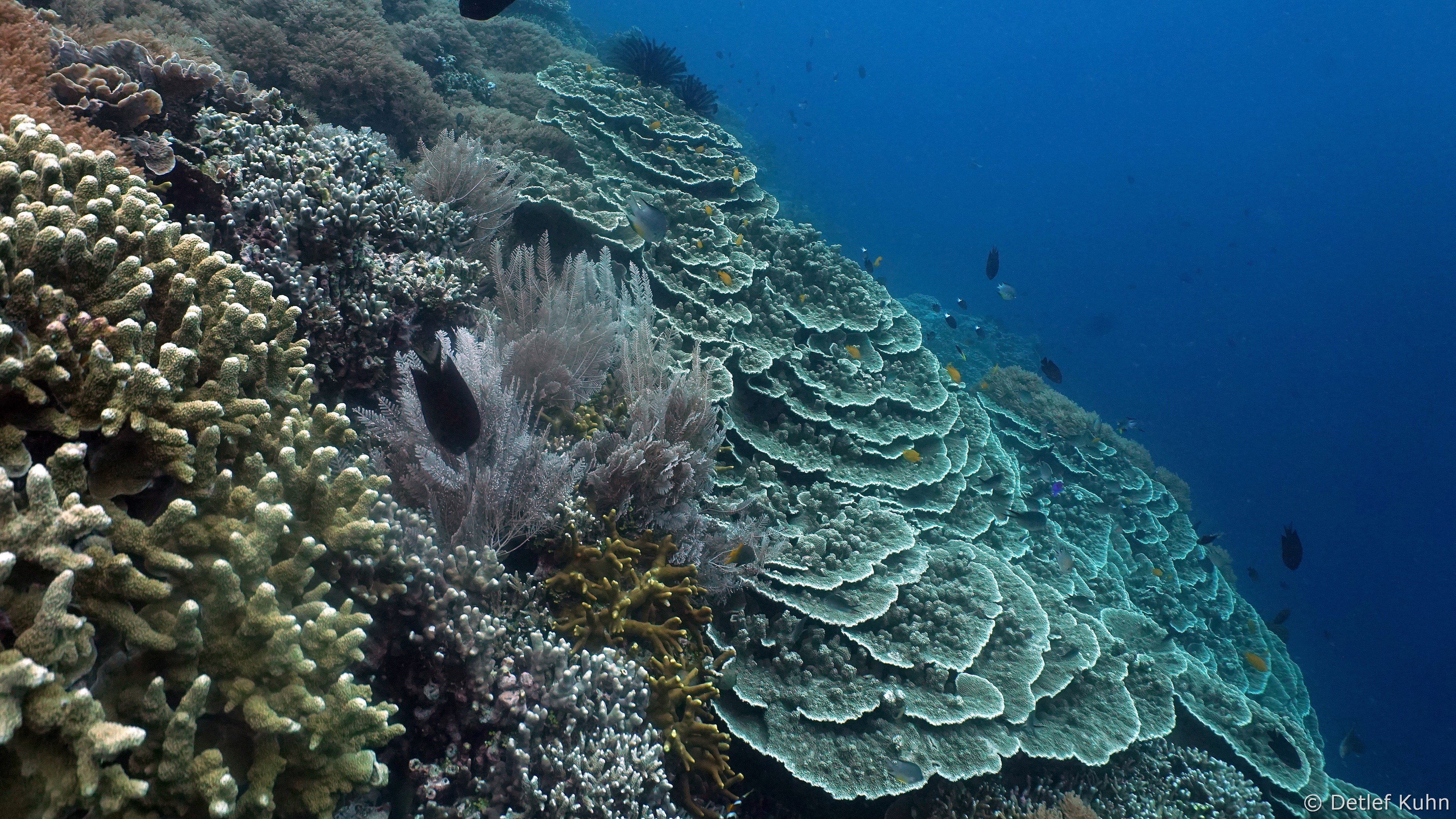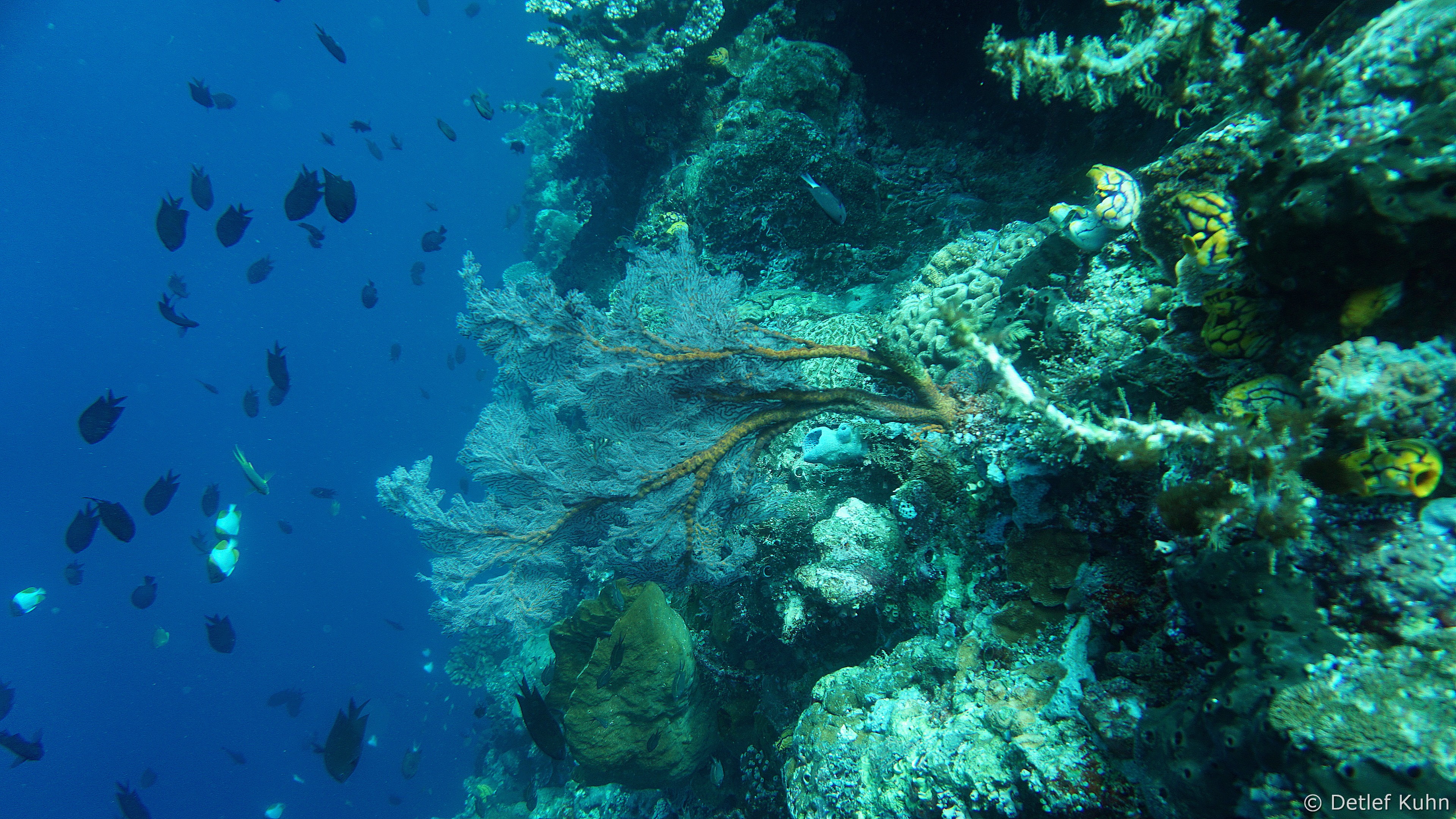 Steilwand-Tauchgang mit einer lebendigen und artenreichen Riffkante und Riffdach.