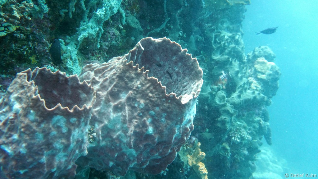 Steilwand-Tauchgang mit reichlich Meeresleben, schönen Korallen und Schwämmen.