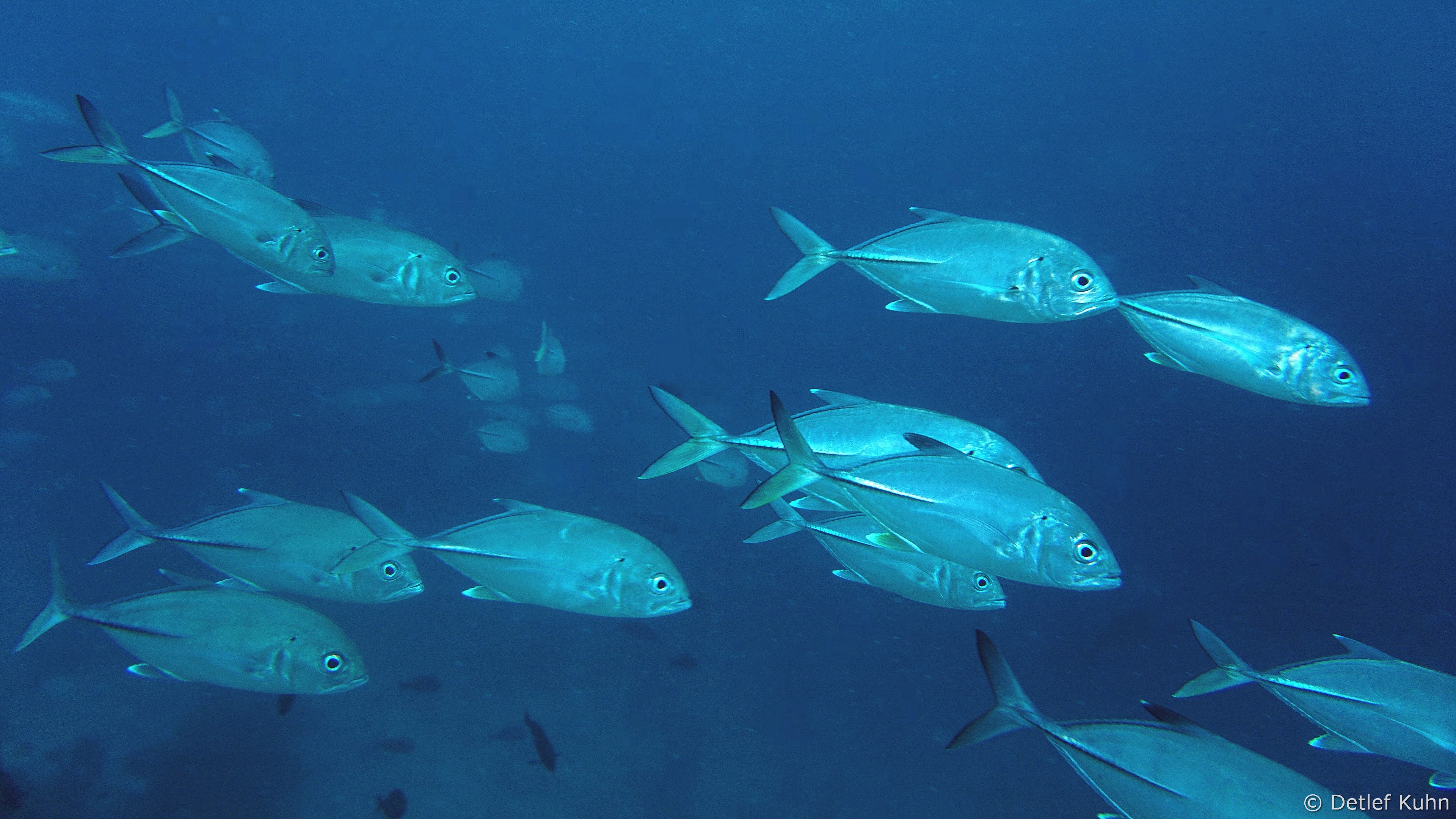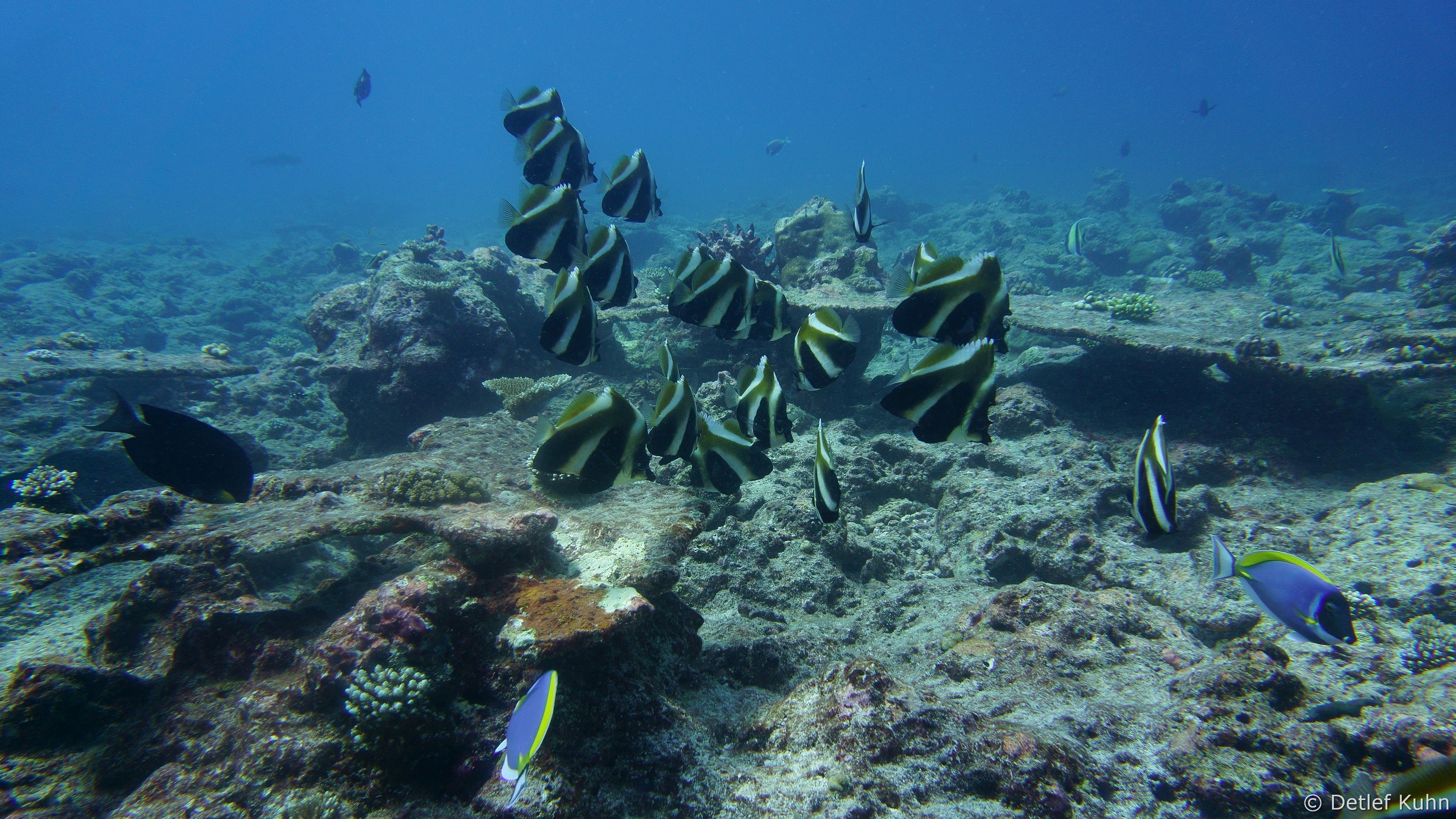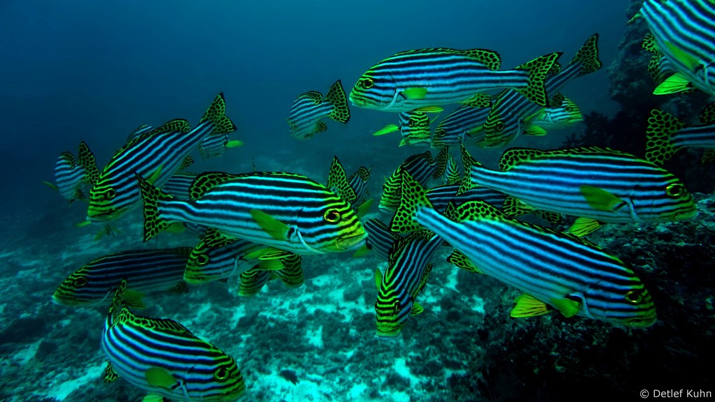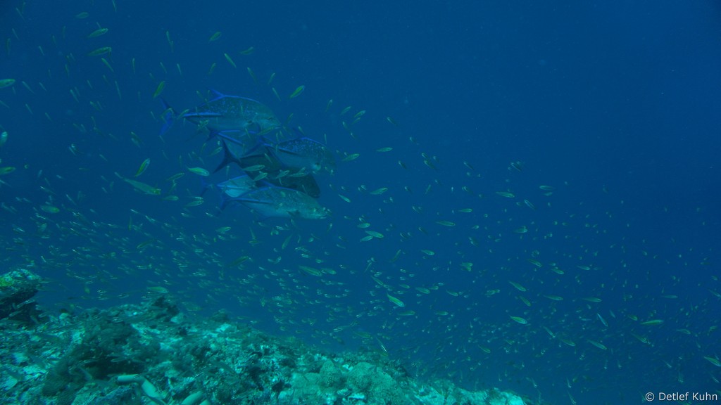Um den Unterwasserberg Kuda Rah Thila halten sich Große Schwärme von Blaustreifenschnappern