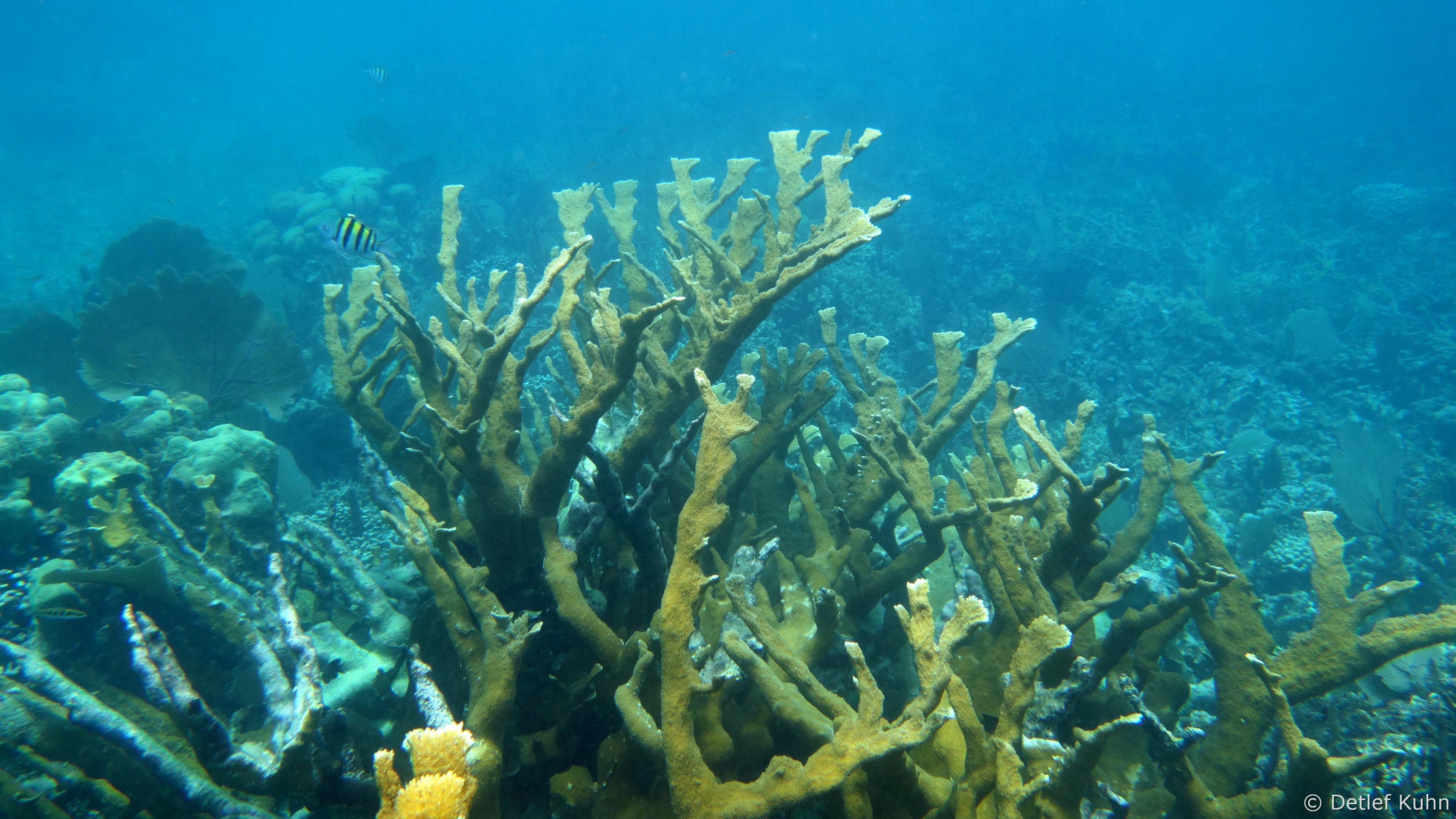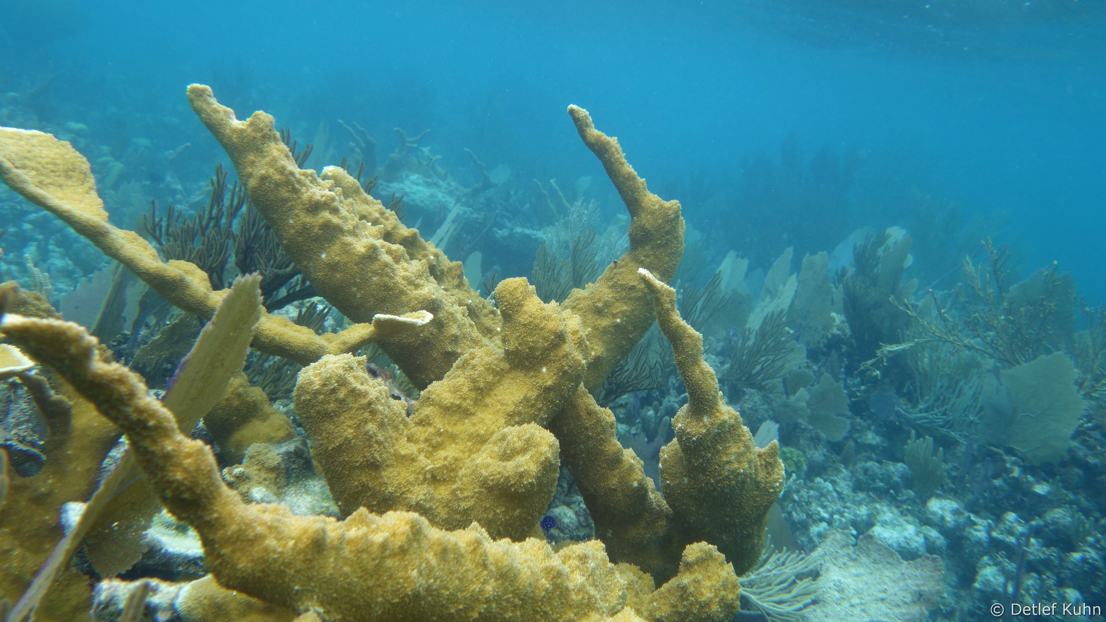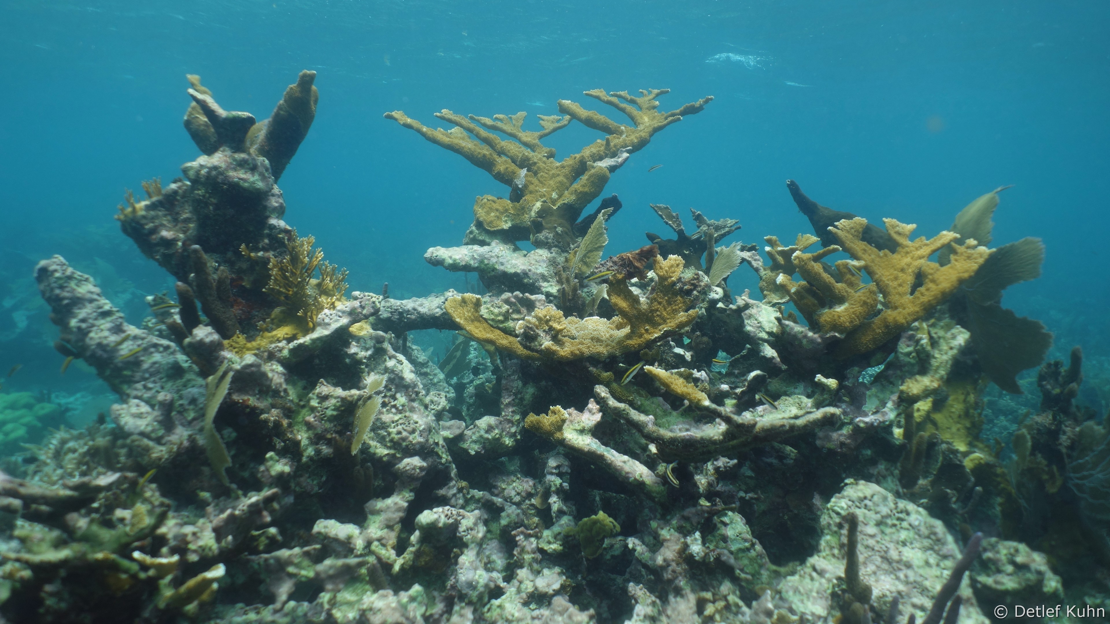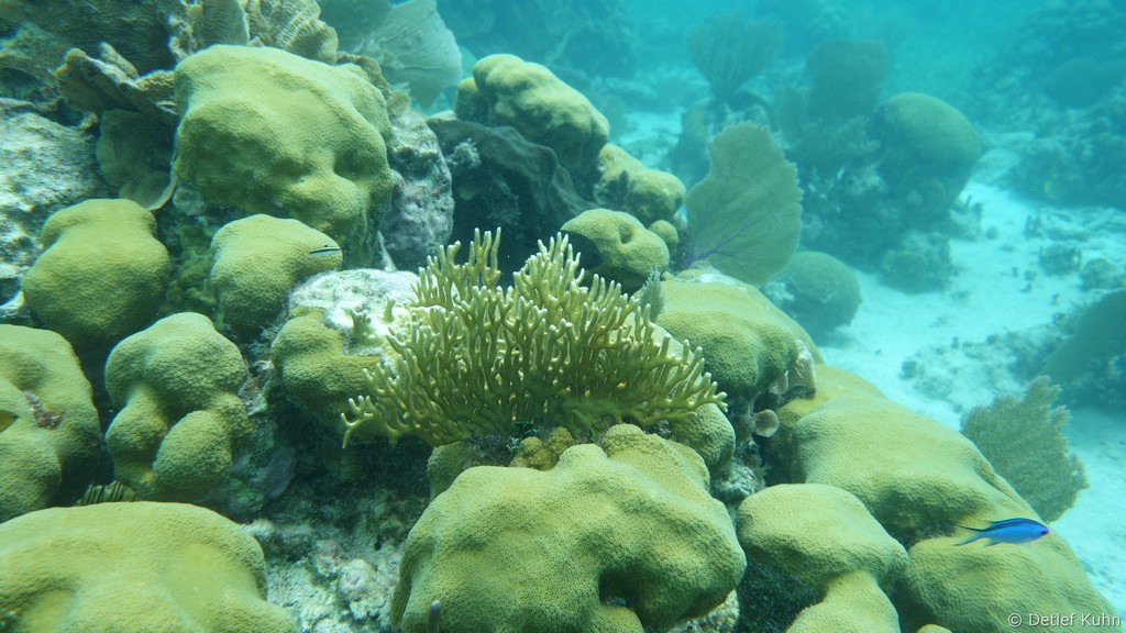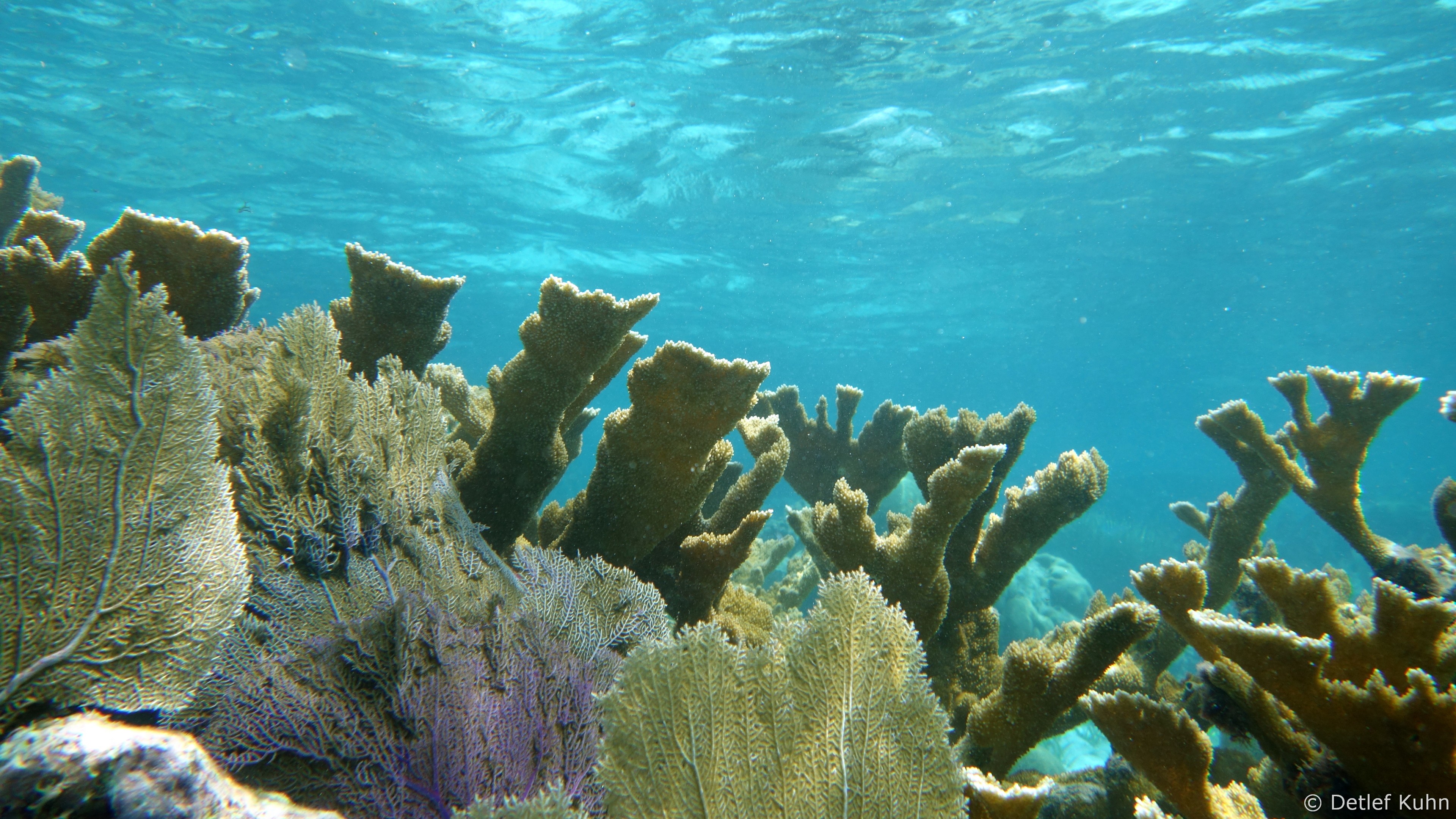 An exponierten Stellen mit starker Strömung oder starkem Wellenschlag können nur Arten überleben, die speziell an diese Bedingungen angepasst sind. Besonders widerstandsfähig ist die Elchgeweihkoralle, deren dicke Kalksteinäste den Kräften von Strömung und Wellen trotzen. In etwas tieferem Wasser sind andere Korallenarten häufiger anzutreffen, darunter die Hirschgeweihkoralle sowie Fingerkorallen und Sternkorallen.