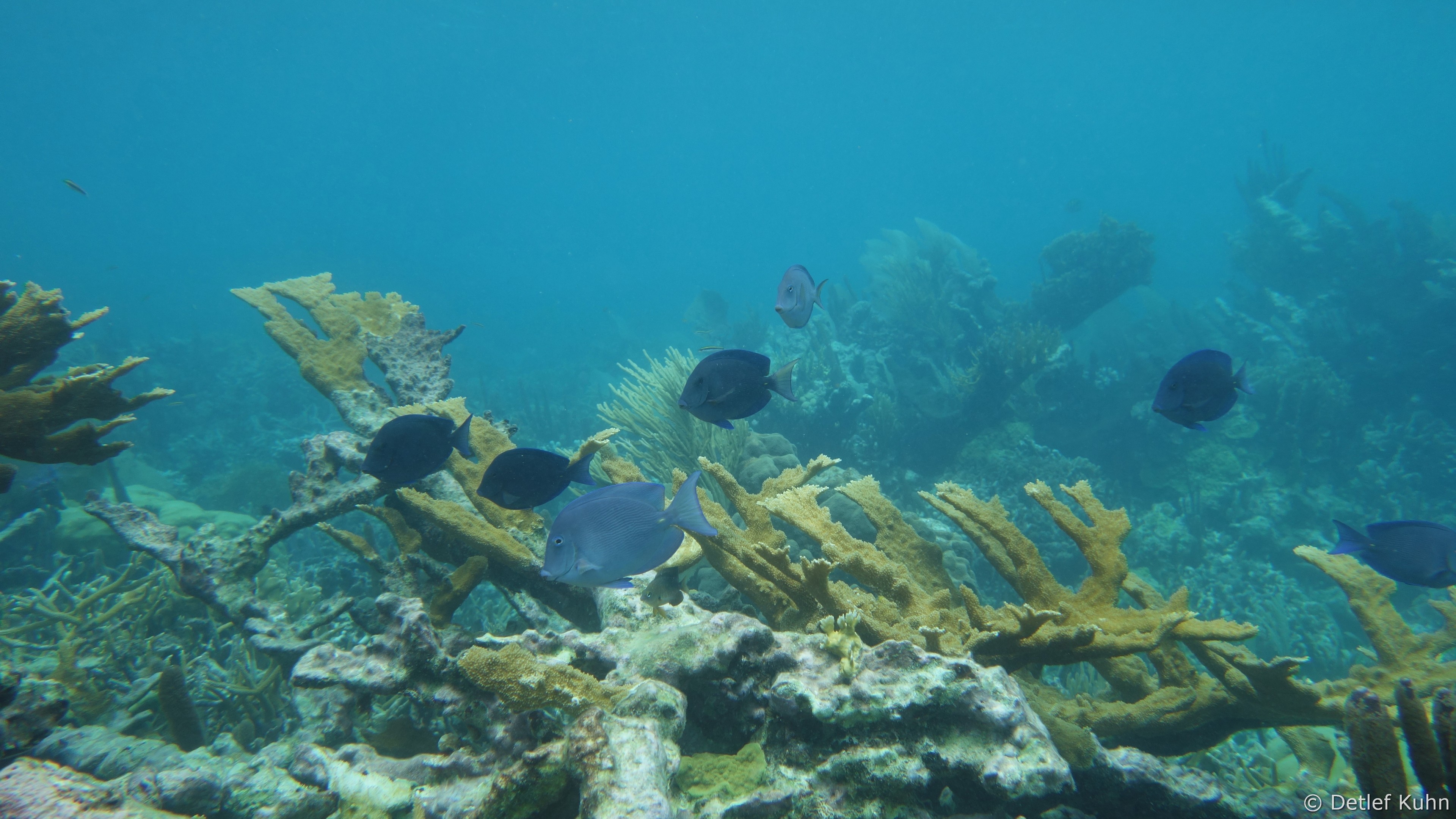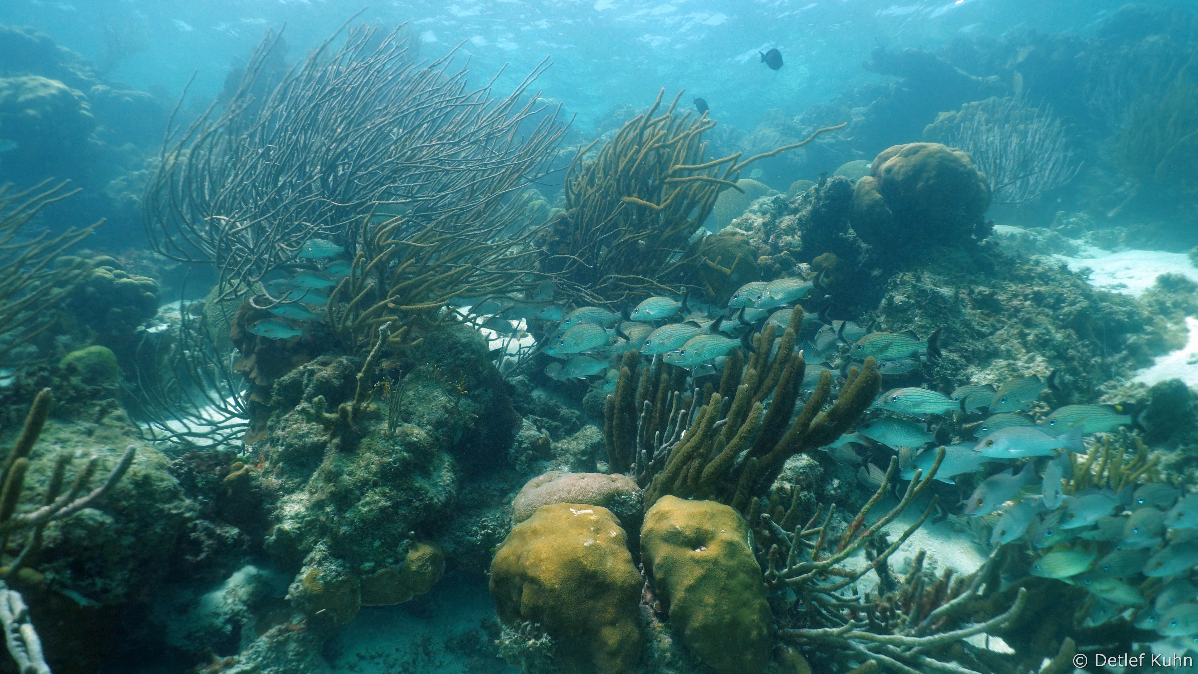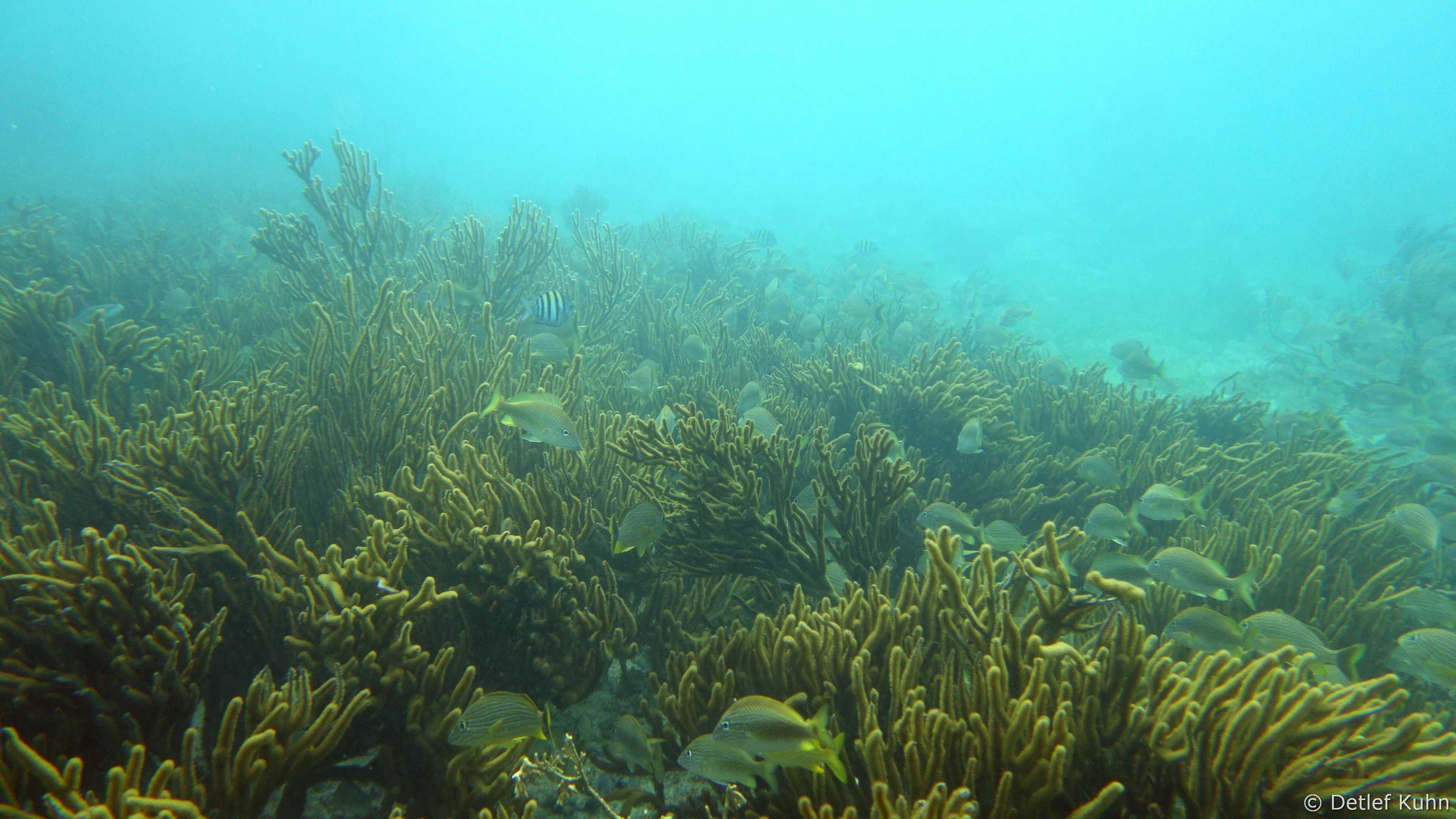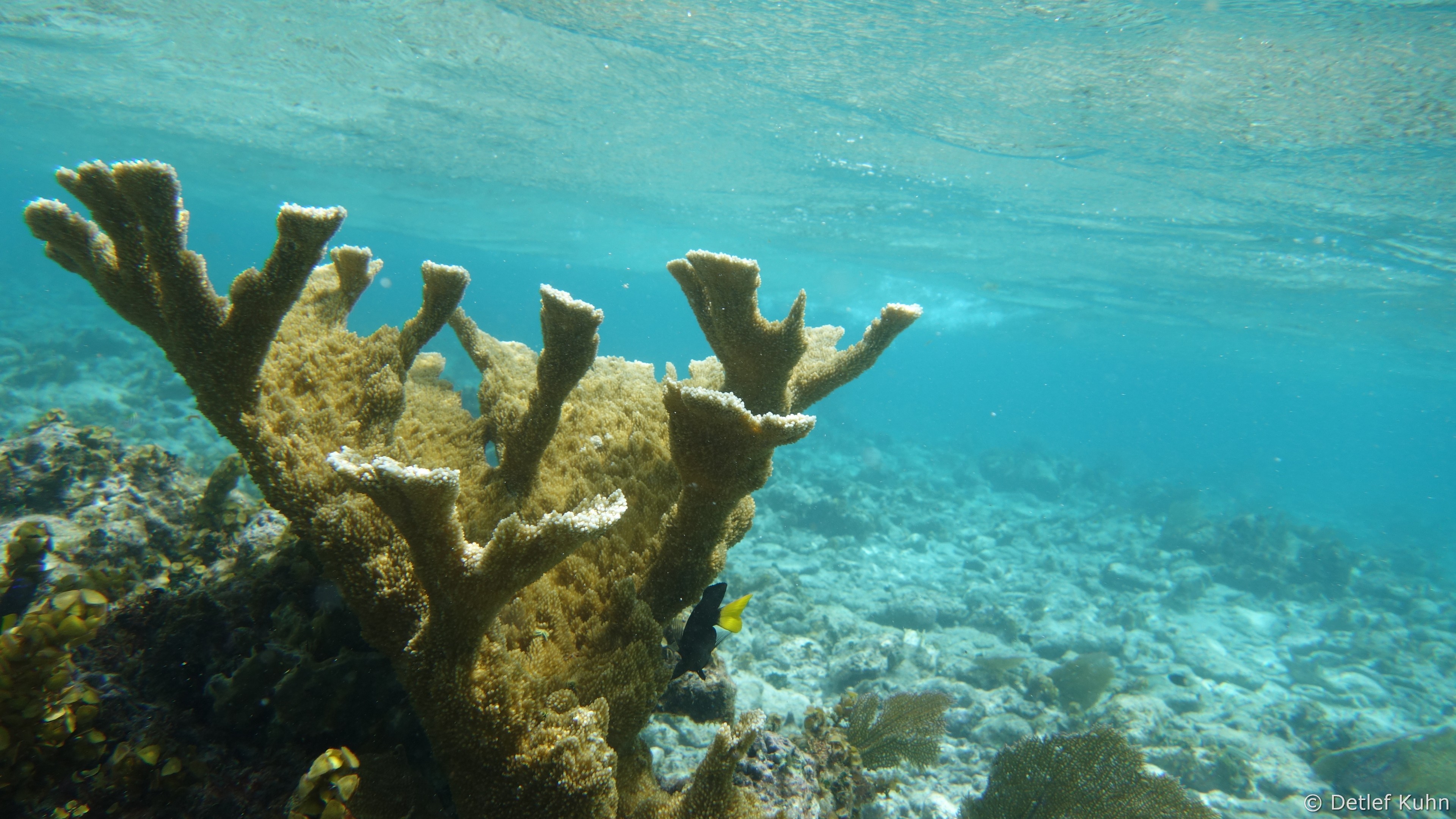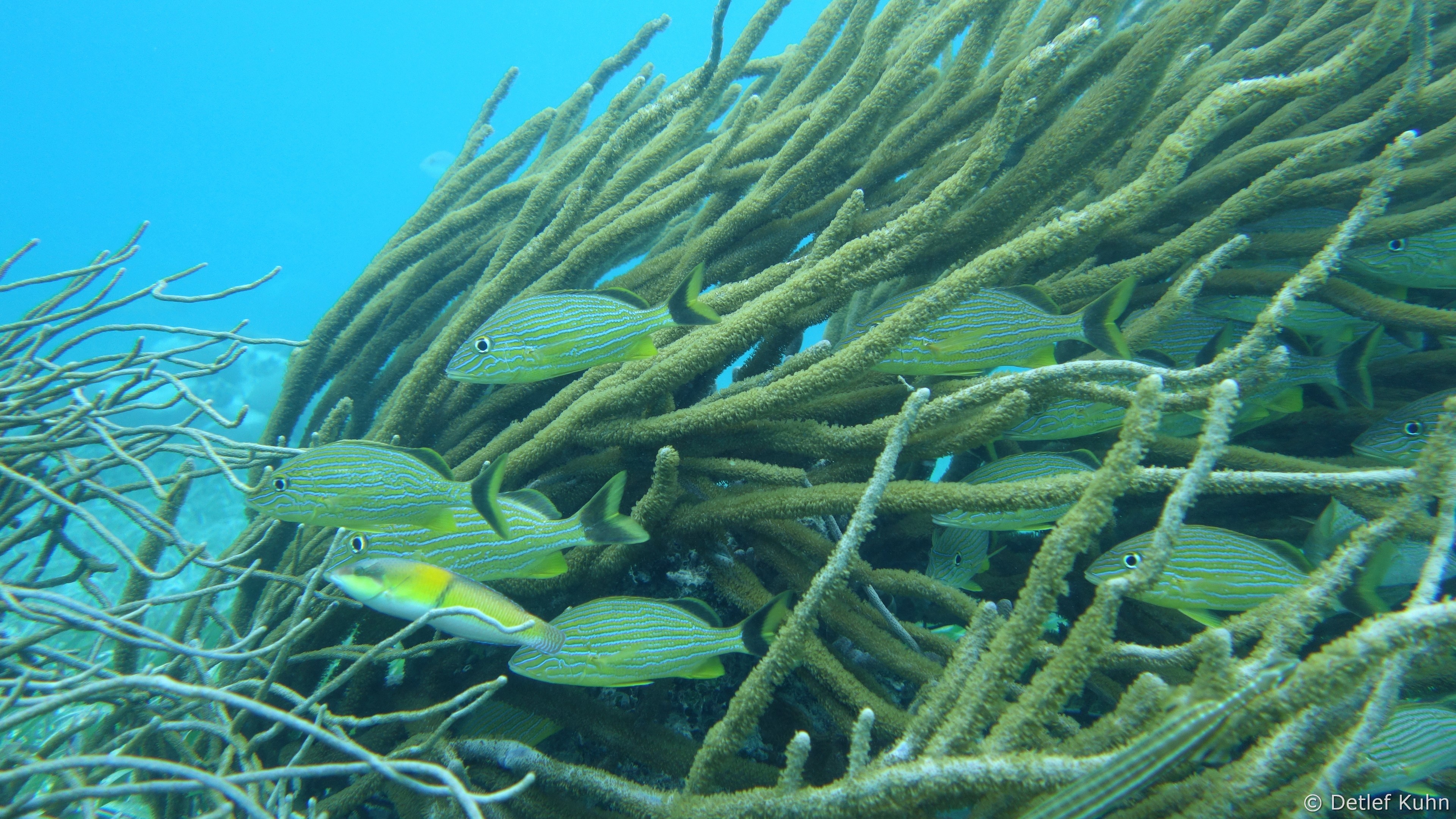 An exponierten Stellen mit starker Strömung oder starkem Wellenschlag können nur Arten überleben, die speziell an diese Bedingungen angepasst sind. Besonders widerstandsfähig ist die Elchgeweihkoralle, deren dicke Kalksteinäste den Kräften von Strömung und Wellen trotzen. In etwas tieferem Wasser sind andere Korallenarten häufiger anzutreffen, darunter die Hirschgeweihkoralle sowie Fingerkorallen und Sternkorallen.