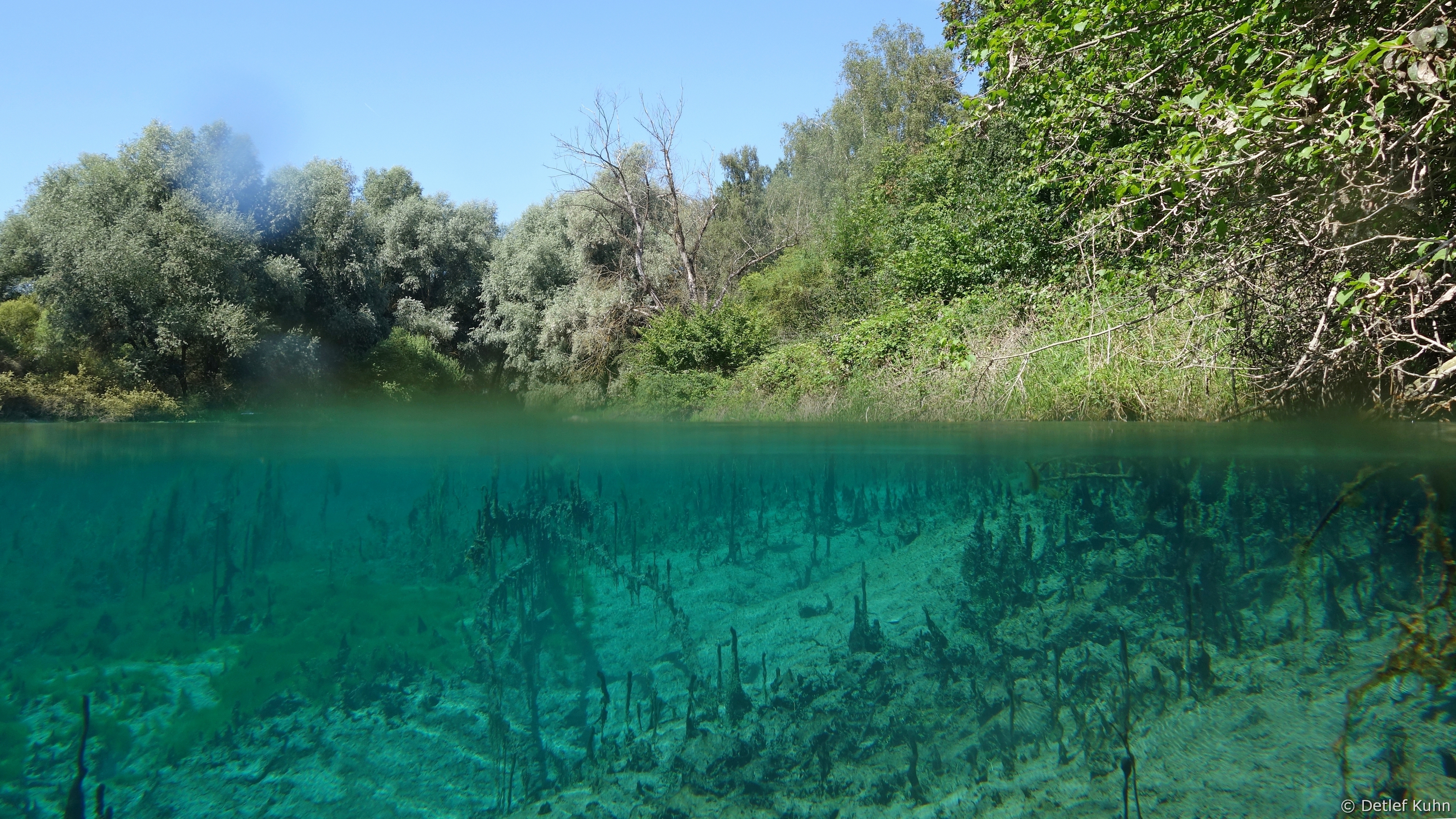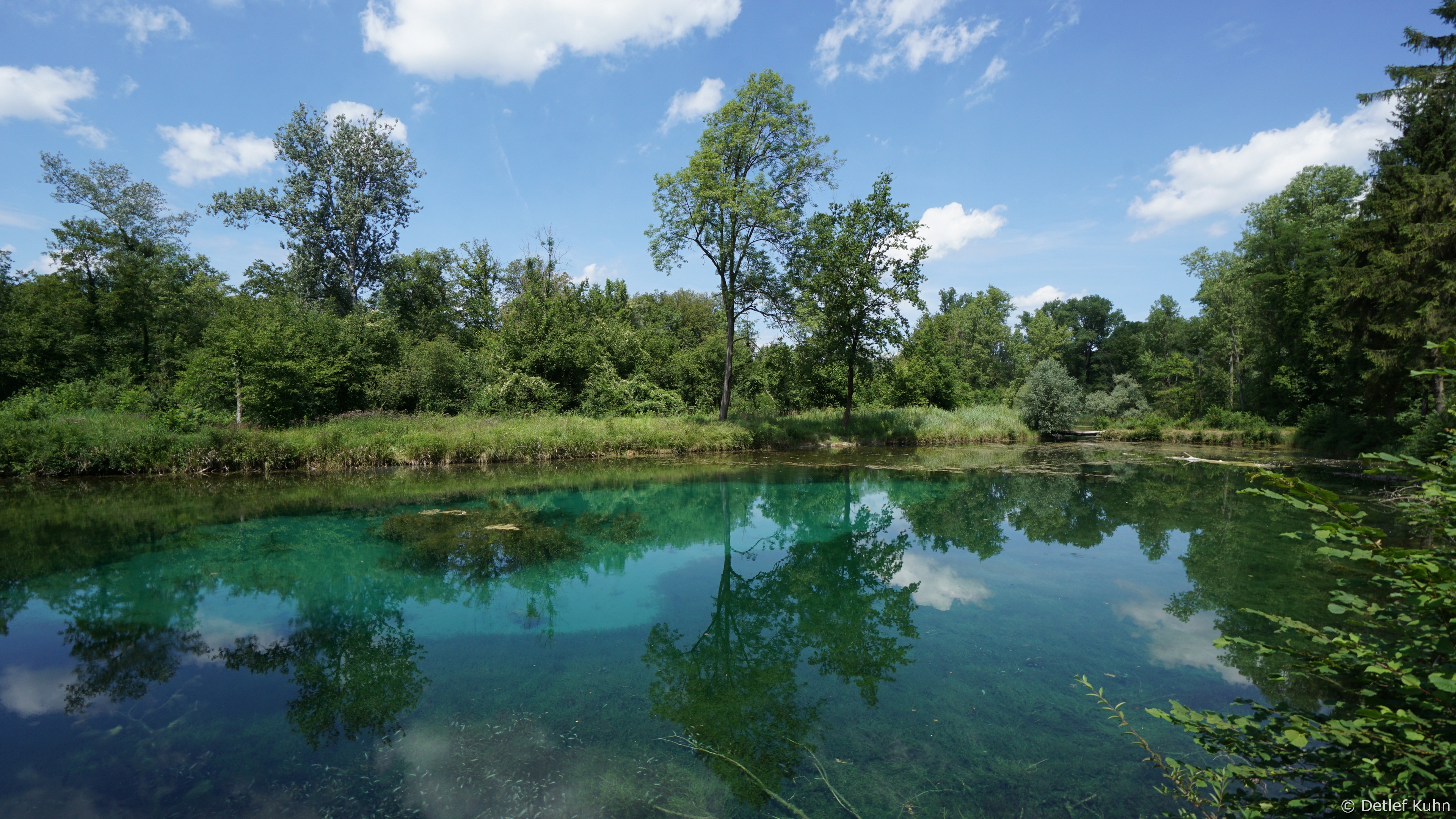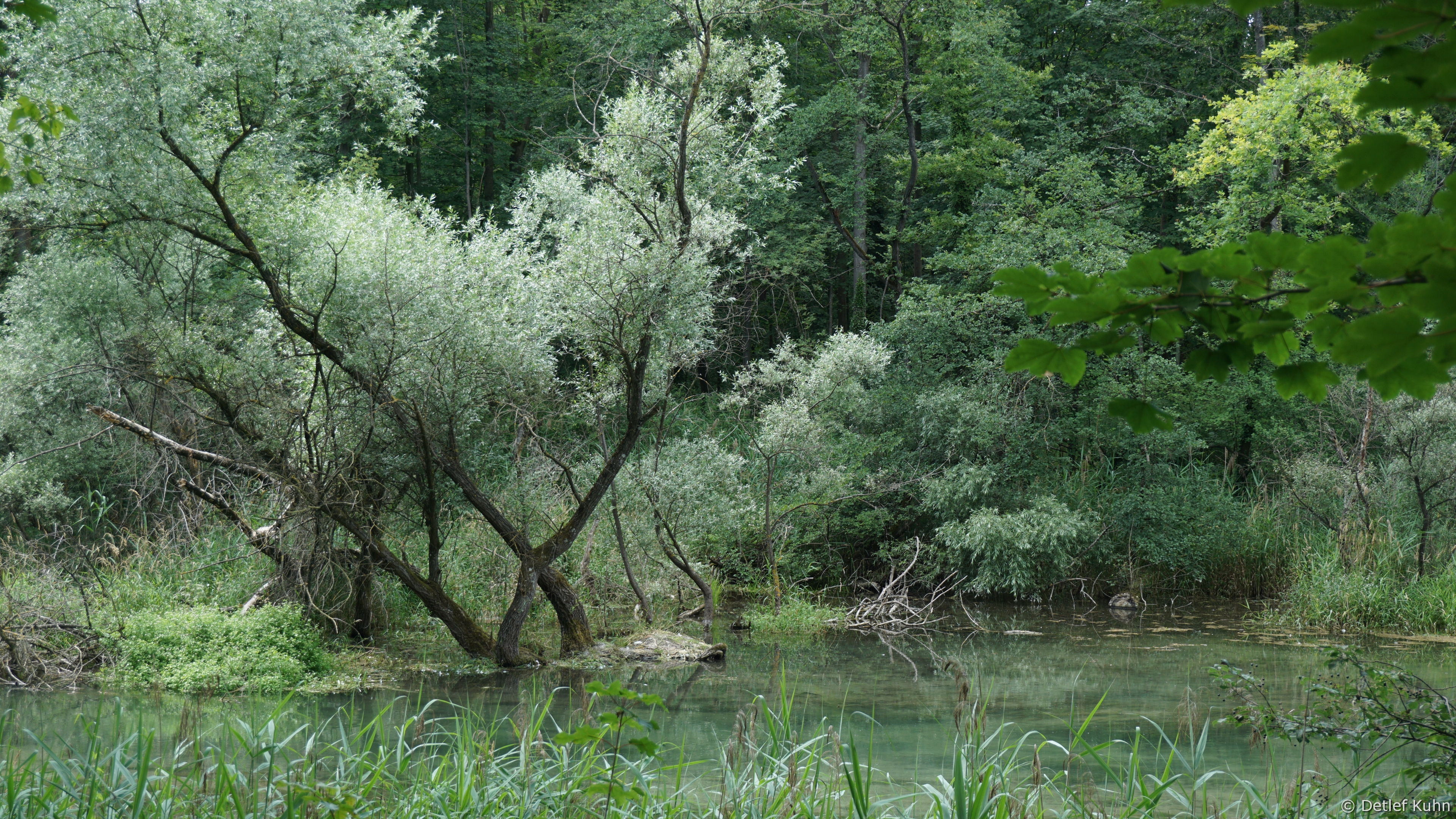 Ein kleiner See mitten im Auwald am südlichen Oberrhein mit kristallklarem, kaltem Wasser.