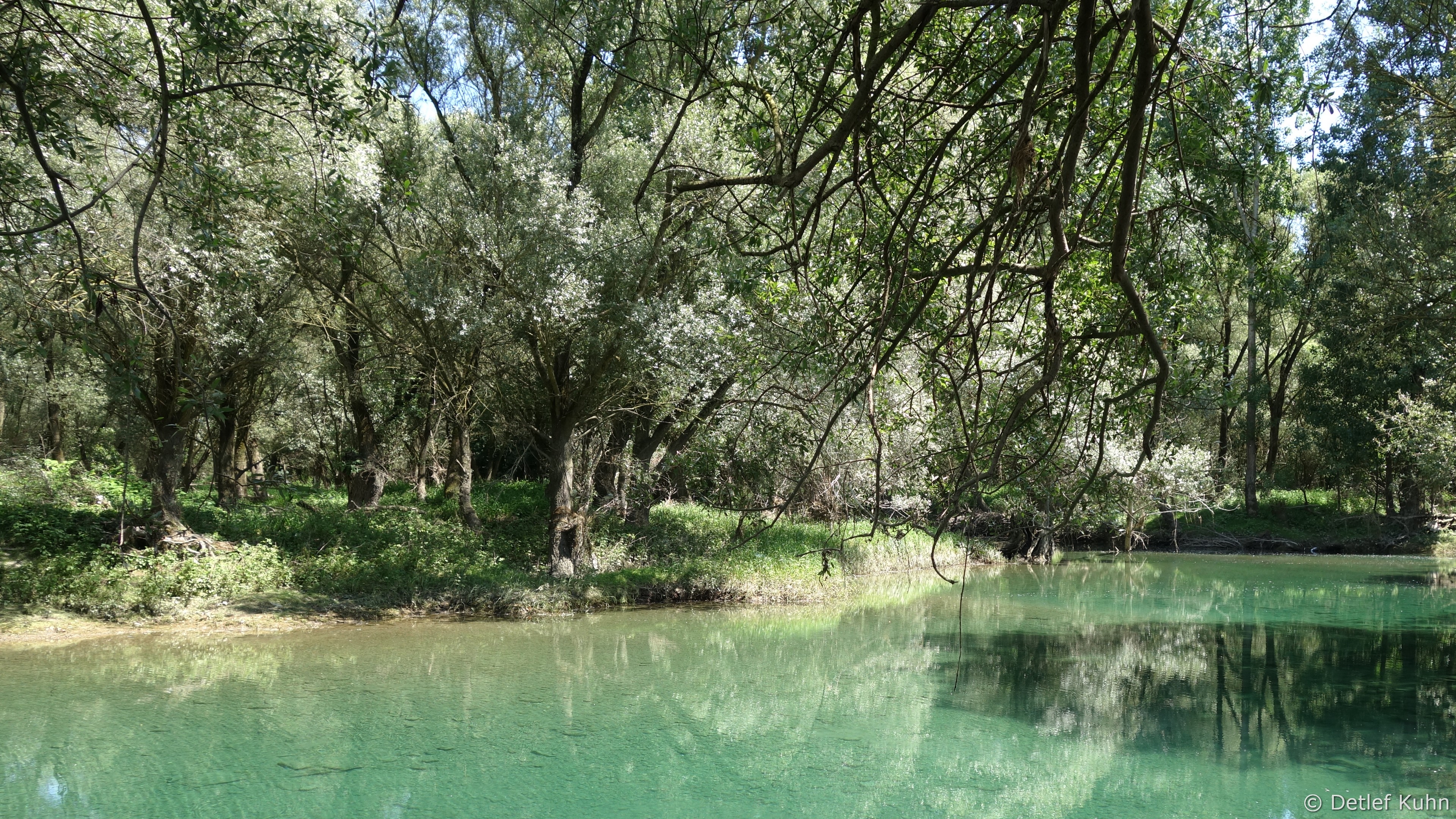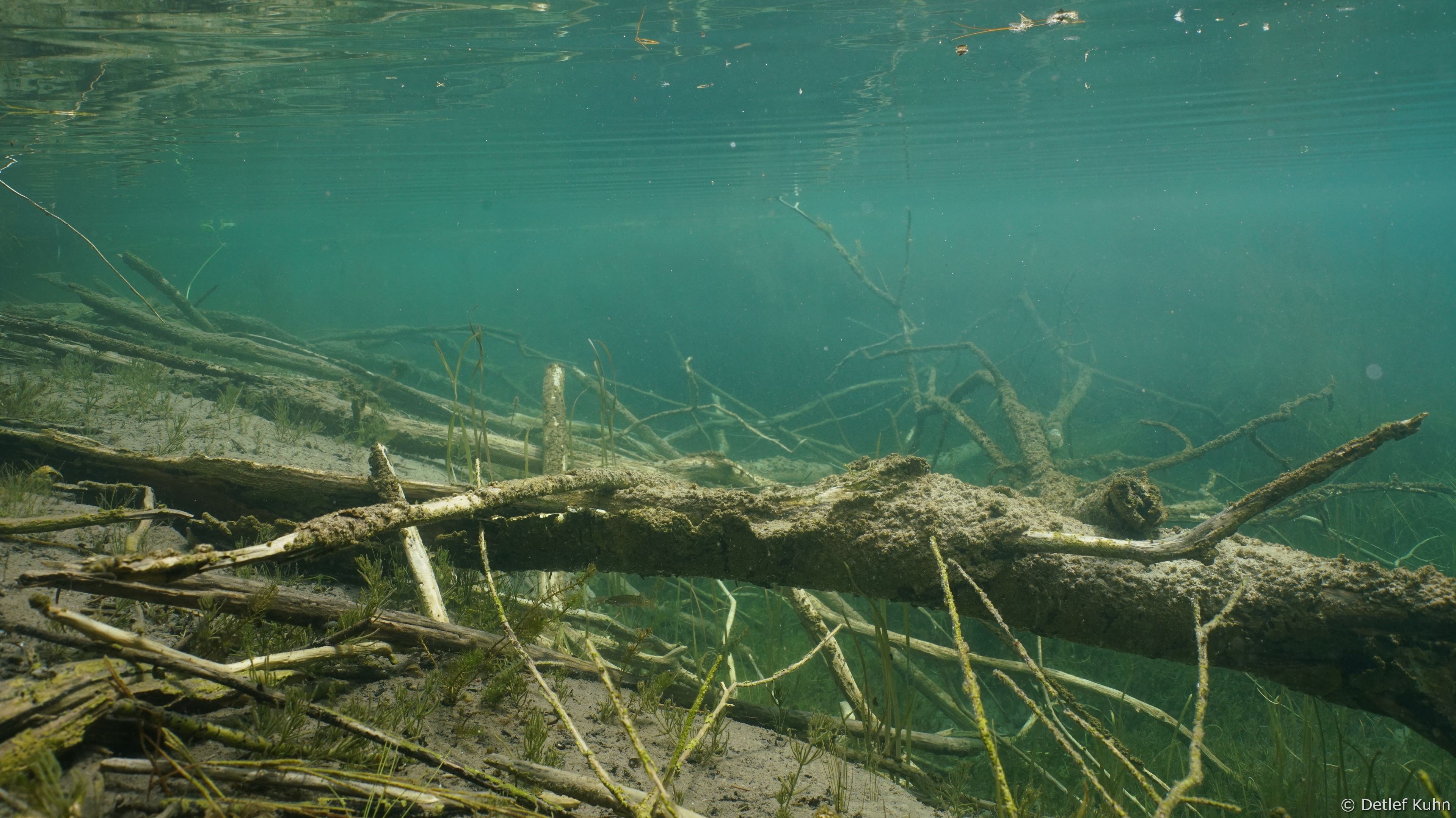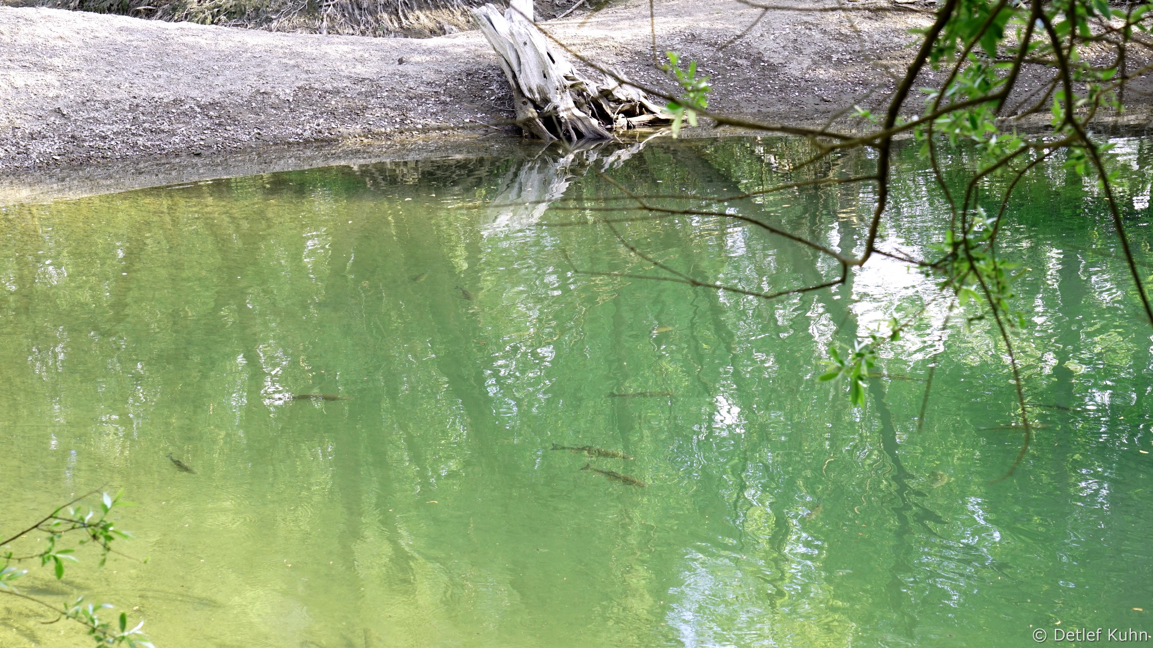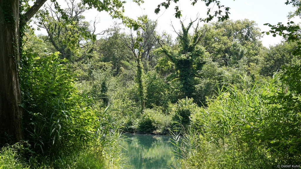Ein kleiner See mitten im Auwald am südlichen Oberrhein mit kristallklarem, kaltem Wasser.