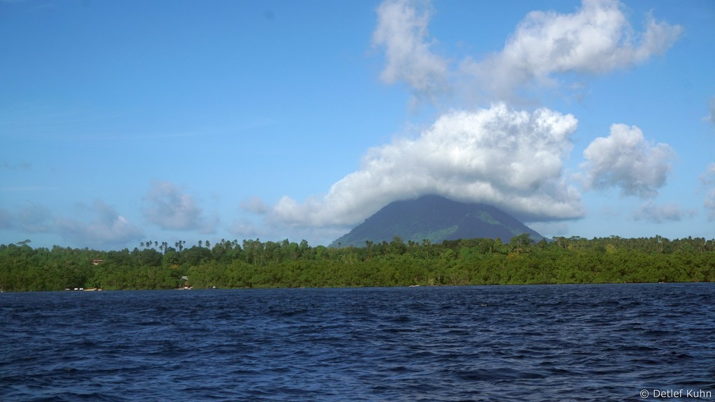 Mangroven von Bunaken dahinter die Vulkaninsel Manado Tua.
