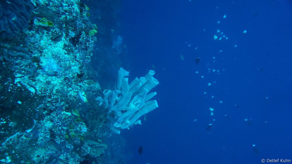 Steilwand-Tauchgang mit reichlich Meeresleben, schönen Korallen und Schwämmen.