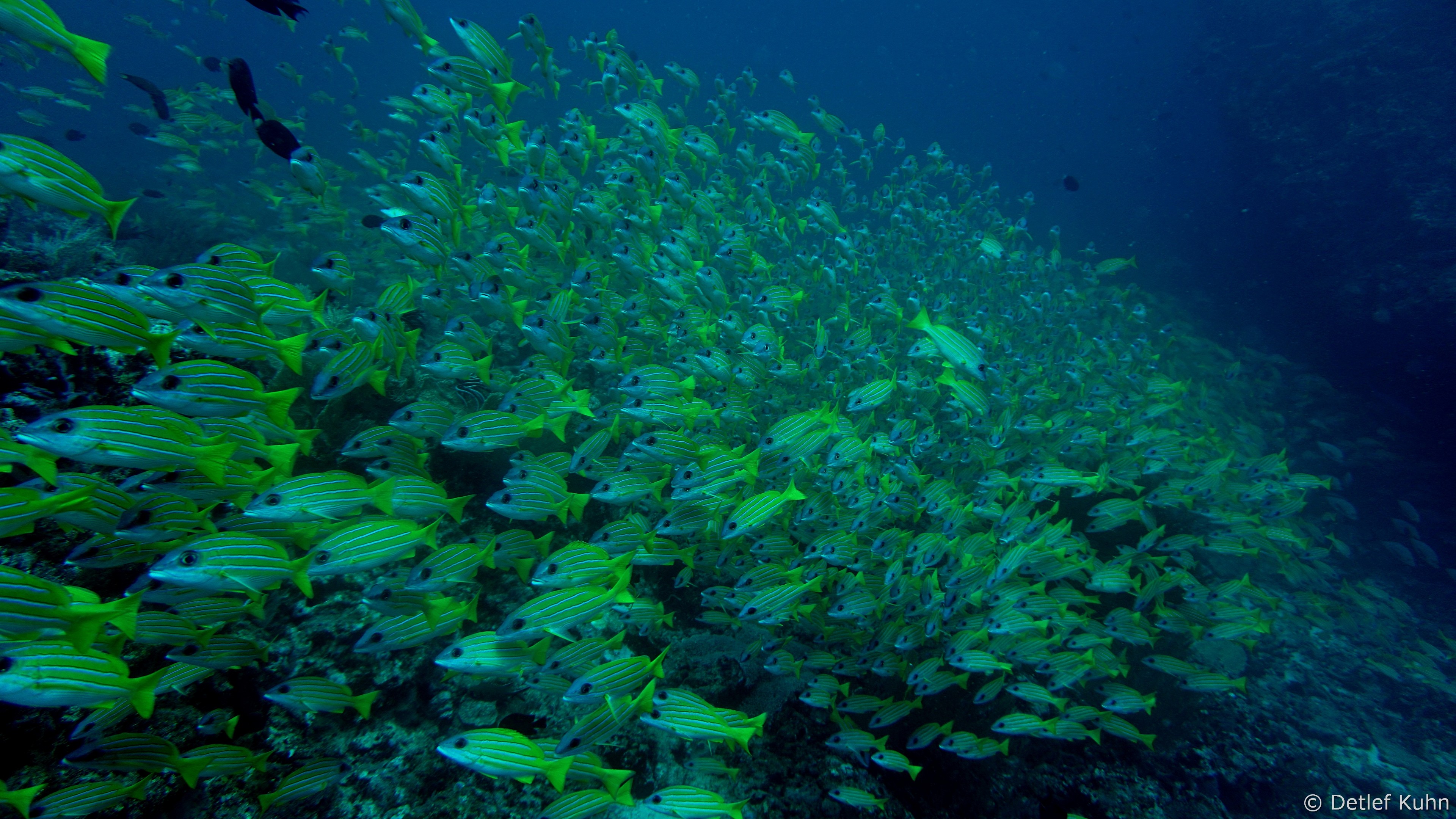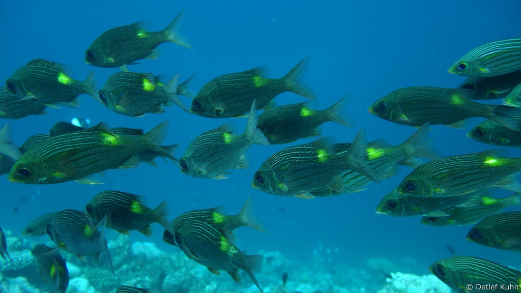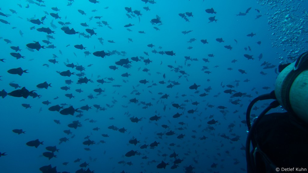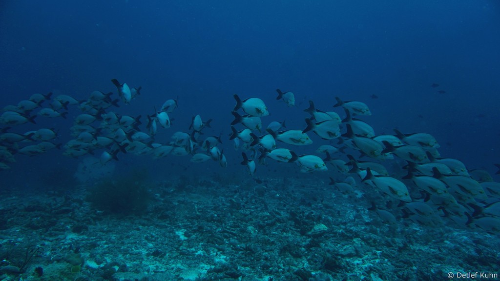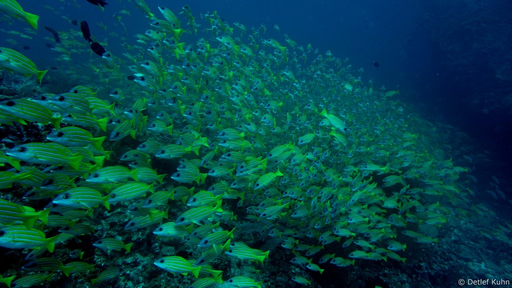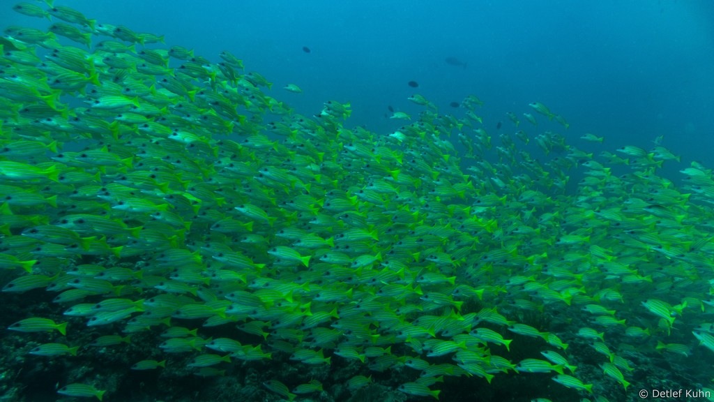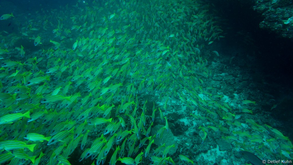 Um den Unterwasserberg Kuda Rah Thila halten sich Große Schwärme von Blaustreifenschnappern