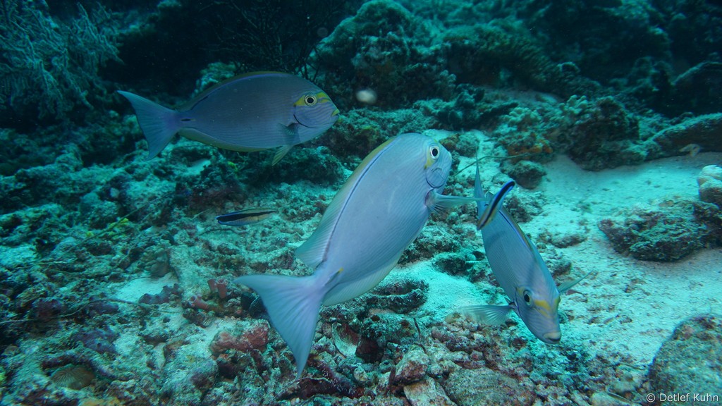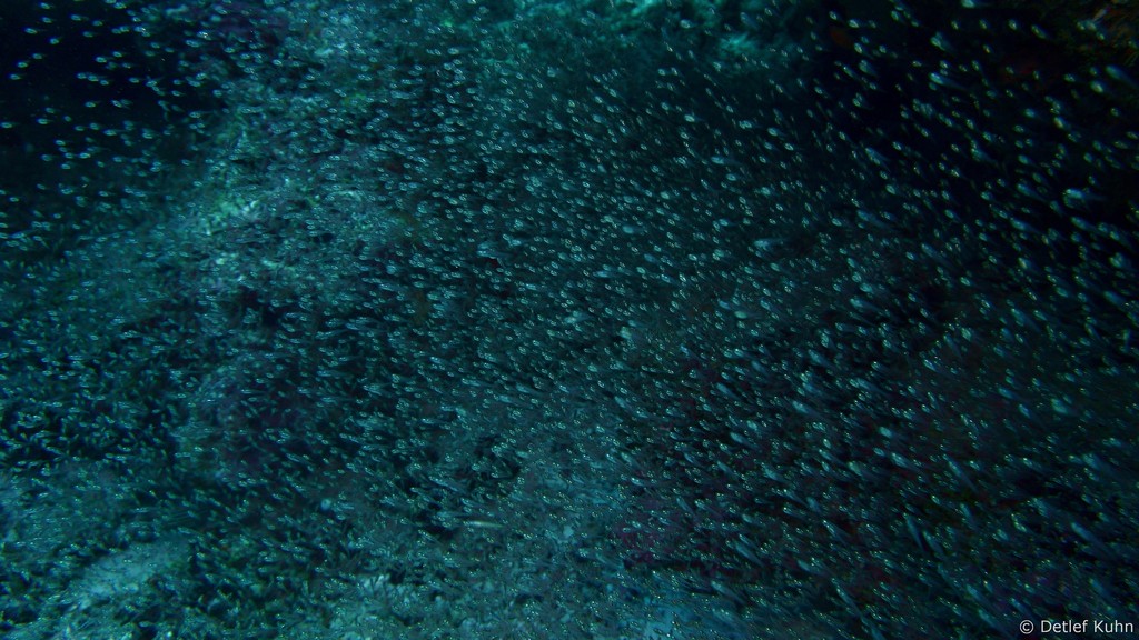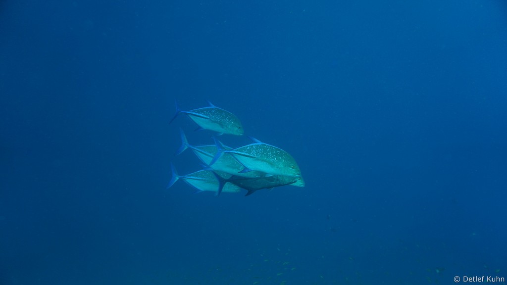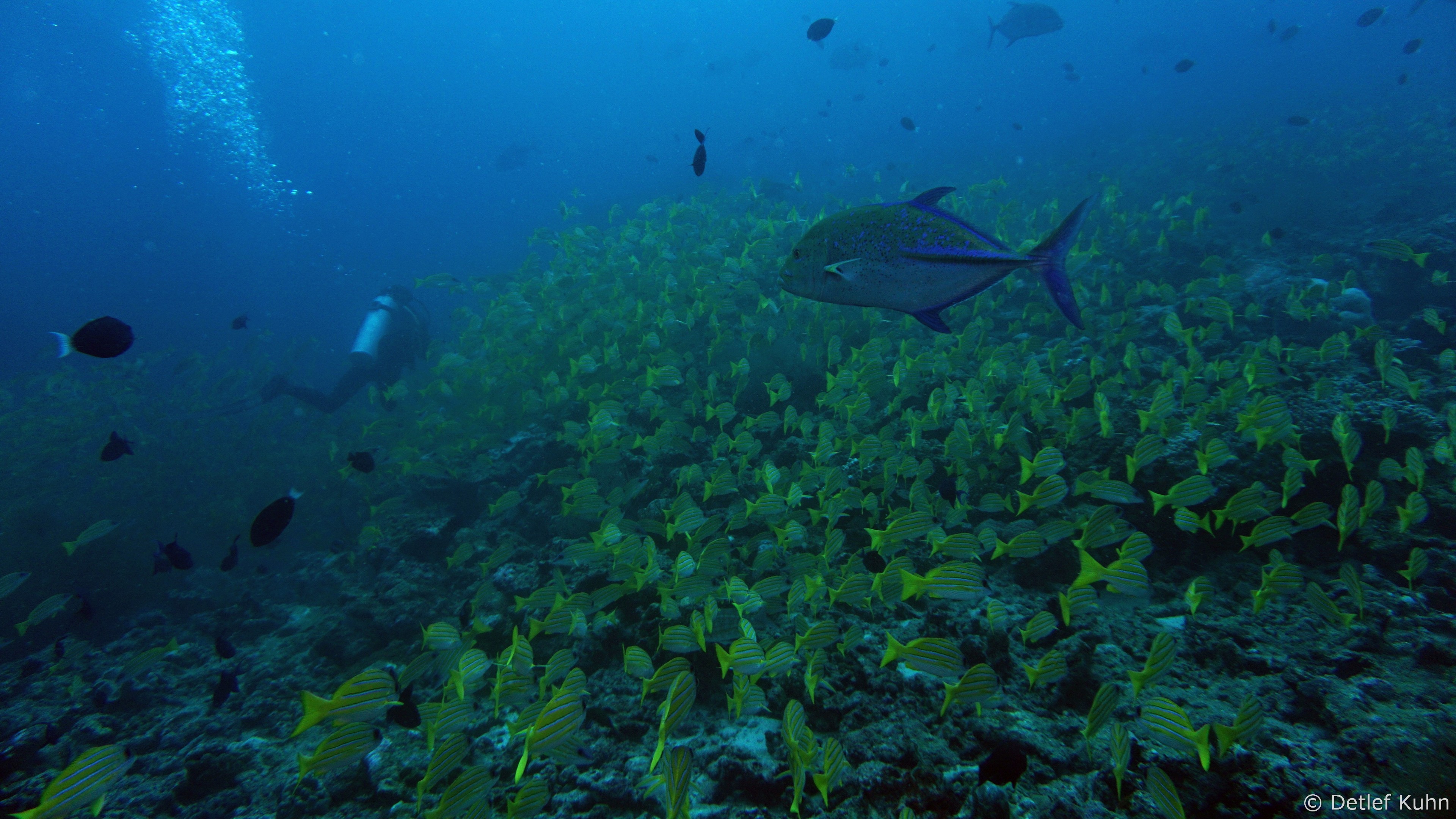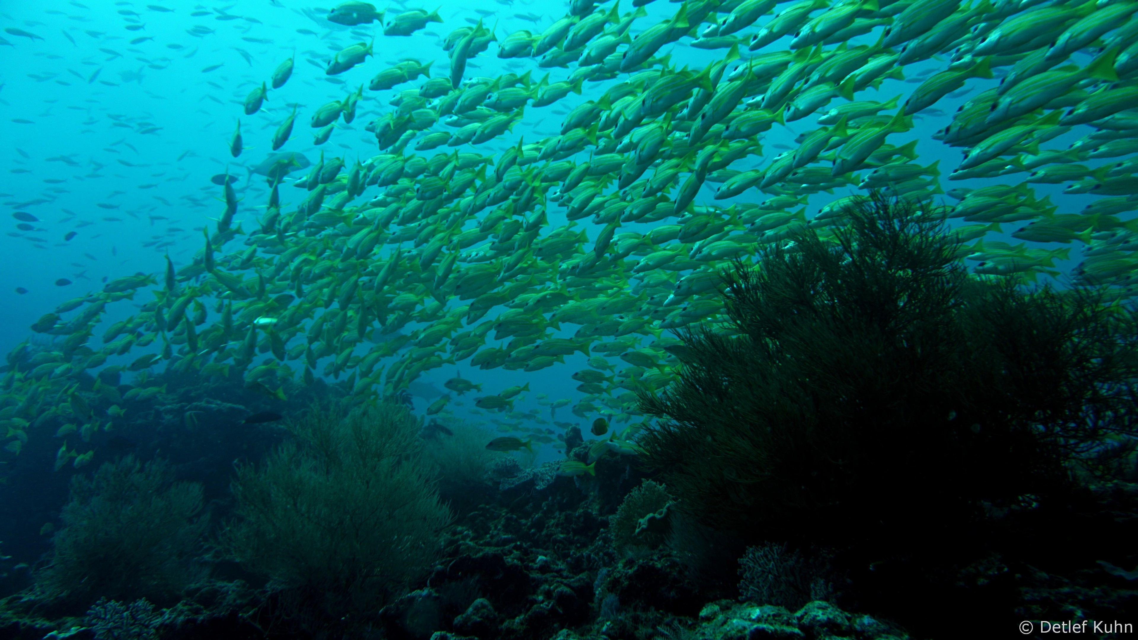 Um den Unterwasserberg Kuda Rah Thila halten sich Große Schwärme von Blaustreifenschnappern