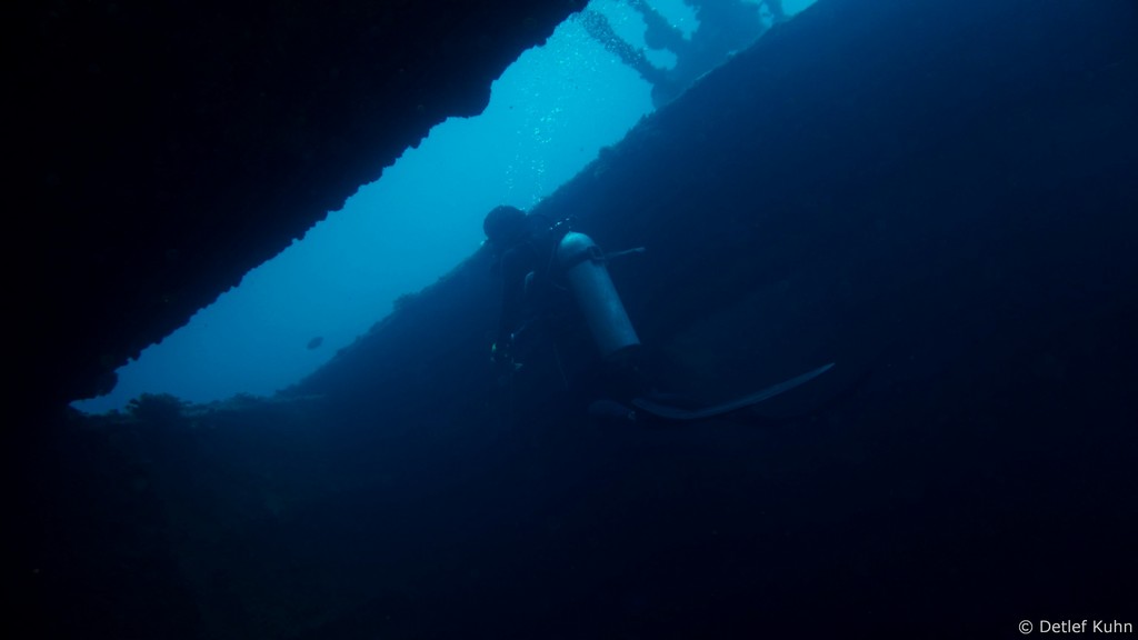 In einer Tiefe von 25 Metern kann man durch den leergeräumten Laderaum hindurchtauchen.